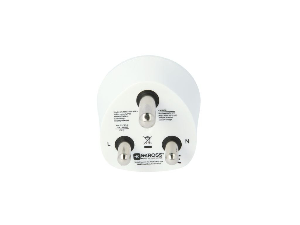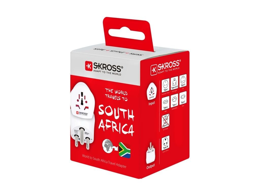 Spoľahlivé pripojenie na cestáchAdaptér SKROSS World to South Africa umožňuje bezpečné používanie zariadenia v zásuvkách v Južnej Afrike a krajinách s podobnými štandardmi zásuviek. Cestujúcim z Českej republiky umožňuje pripojiť len neuzemnené vidlice napájacích káblov, napr. telefóny, tablety, holiace strojčeky a nositeľnú elektroniku. Vďaka univerzálnej zásuvke možno pripojiť aj napájacie káble z iných krajín, uzemnené aj neuzemnené.