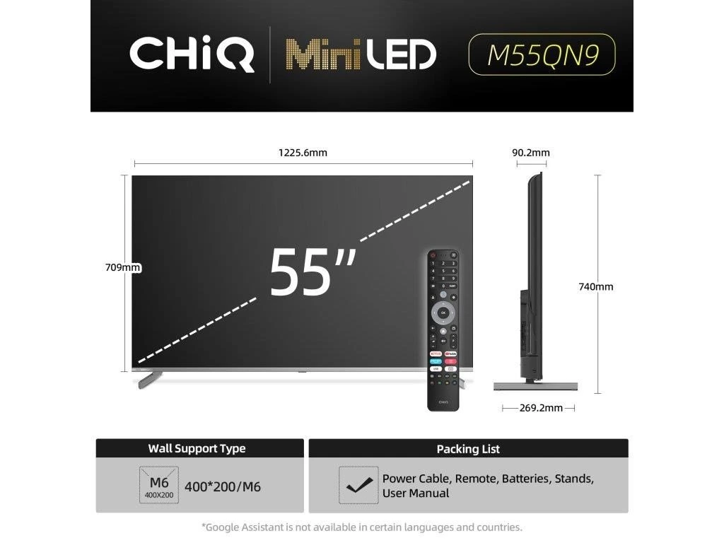 Televízor CHiQ M65QN9V 65", UHD MiniLED Google TV DLG 120 Hz CHiQ M55QN9V, 55" (139 cm), kovový bezrámčekový Smart MiniLED Google TV 5.0, Ultra HD (4K), DLG 120 Hz dbx-tv, HDR 10, HLG, Dolby Vision, WiFi 2.4/5G, Bluetooth 5.0, webový prehliadač, Google Assistant, Chromecast, O2 TV, YouTube, Netflix, Prime Video, 2GB + 16GB pamäť, 4x HDMI, 2x USB, CI slot, 20 W. bezrámikový MiniLED Ultra HD Google TV 5.0 s DLG 120 Hz, MEMC, lokálnym stmievaním, väčšou pamäťou 2+16 GB, Dolby Atmos a vylepšeným zvukom dbx-tv. Televízor má zabudovaný štvorjadrový, vysoko výkonný procesor A55, ktorý využíva najnovšiu nanočasticovú technológiu a dokáže ľahko dekódovať video streamy z rôznych formátov. Jeho prevádzka je úplne plynulá a zaručuje rýchlu odozvu. Domáca zábava ešte nikdy nebola taká skvelá. Prejdite na najnovšiu technológiu: Je to kovový bezrámikový televízor QLED Smart Google TV 5.0 s DLG 120 Hz a MEMC, HDR10, HLG, Dolby Vision, lokálnym stmievaním, obrazovkou Ultra HD s rozlišením 3840 x 2160 pixelov, Dolby Atmos. Televízor MiniLED Google TV 5.0 DLG 120 Hz a MEMC - ideálne na hranie her Miestne stmievanie České a slovenské menu Hlasový asistent na diaľkovom ovládaní 2 GB RAM + 16 GB ROM 3D priestorový zvuk Najnovšia bezrámčeková výrobná technológia Jednoduchá montáž na stenu podľa štandardov VESA (400 x 200 mm) Viac ako 65 rokov skúseností s výrobou televízorov Výroba a servis v Nymburku MiniLED - obrazovka QLED s rozlišením Ultra HD a lokálnym stmievaním jas, vďaka čomu dokáže monitor CHiQ U55QM9V zobraziť viac ako miliardu farebných odtieňov, oveľa širšiu škálu farieb a farebných tónov. Modrá, zelená a červená sú zobrazené presnejšie a intenzívnejšie ako na bežných televízoroch. Porovnajte si aj detaily s rozlišením HD alebo Full HD. Na tomto televízore uvidíte oveľa viac. Miestne stmievanie má rôzne úrovne kvality podľa toho, akú hustú sieť zón podsvietenia obrazovka má. Jedna zóna tak môže podsvietiť niekoľko tisíc pixelov. Preto čím viac zón má podsvietenie, tým lepší bude kontrast obrazovky. Mini LED je technológia, vďaka ktorej sú diódy menšie, čo umožňuje presne takéto zvýšenie kvality obrazu. Lokálne stmievanie zapína podsvietenie ľan tam, kde má byť obraz jasný. Zvyšuje kontrast obrazovky, a tým aj celkovú kvalitu obrazu. V oblastiach s černou farbou je podsvietenie úplne neatívne. Mini LED diódy majú veľkosť 0,1 mm alebo menej. Ide o najlepšiu možnosť lokálneho stmievania, ktorá je v súčasnosti v televízoroch k dispozícii. Keďže MiniLED je stále LCD technológia, jej hlavná výhoda spočíva vo veľmi prijateľnej cene. HDR10 / HLG / Dolby Vision s vysokým kontrastom a ostrými detailmi. Objavte každý detail. Televízor je vybavený technológiou dekódovania videa HDR pre vyššiu kvalitu obrazu. Odhaľuje najjasnejšie farby a zároveň najtmavšie tieni. Vďaka nej uvidíte viac detailov. Vychutnajte si doma dokonalý filmový audiovizuálny zážitok a staňte sa súčasťou diania na obrazovke. Úžasný zvuk s technológiami Dolby Atmos, Dolby Audio a dbx-tv Dolby Atmos je technológia priestorového zvuku, ktorá poskytuje pohlcujúci pocit, akoby hlas osoby alebo zvuk objektu obklopoval celé vaše telo v 3D priestore. Spočíva v presnejšom rozložení zvuku v priestore, pričom sa využíva viac kanálov, ktorými sa zvuk šíri, a spôsob, akým sa zvuk mísi. Väčší počet kanálov umožňuje zvuk pomyselne rozdeliť na viacero zložiek. Jeden kanál tak môže obsahovať streľbu, iný zvuk mechaniky zbrane. Vďaka technológii Dolby Atmos je preto umiestnenie zvuku v priestore podstatne presnejšie. Úžasný zvuk a hlbšie prepojenie s obrazom. Vďaka pokročilým nastaveniam prináša 5-pásmový ekvalizér do vášho domova úžasný, viacvrstvový zvuk ako v kine. Je tiež pripravený poskytnúť vám vynikajúce vylepšenie zvuku dbx-tv, ktoré pochádza od popredných svetových vývojárov zvuku. Toto riešenie obsahuje: Total Sonics®, balík vylepšení, ktorý poskytuje televízorom bohaté, hlboké basy, výrazné výšky, 3D priestorový zvuk a ďalšie funkcie Total Volume®, najúčinnejšie a najvýkonnejšie ovládanie hlasitosti Total Surround® zahalí divákov do pohlcujúceho zvukového zážitku vďaka zabudovaným reproduktorom. Ďalšie zvukové vylepšenia, ako napríklad Virtual Surround a Stereo Synthesis Inovatívne využíva digitálny zvukový procesor (DSP) na vyladenie a optimalizáciu reproduktorov, aby ste mali prístup ku krištáľovému čistému zvukovému zážitku. DLG 120 Hz prináša plynulý herný zážitok a MEMC DLG 120 Hz - 120 Hz obnovovacia frekvencia znižuje zpoždenie a poskytuje plynulý herný zážitok; spolu s technológiou MEMC eliminuje rozmazanie pohybu a poskytuje čisté a plynulé prechody pre rýchlo sa pohybujúce objekty. Hráči si môžu vychutnaťť vynikajúce vizuálne efekty v strielačkách a závodných hrách. MEMC zaisťuje, že rýchle scény sú plynulé a hladké, čo oceníte najmä pri sledovaní športových zápasov (tenis, hokej, futbal), automobilových závodov alebo akčných filmov. Google TV 5.0 a Chromecast Televízor Google TV 5.0 ponúka užívateľsky prívetivé rozhranie, ktoré umožňuje jednoduchý prístup k aplikáciám, ako sú Netflix, YouTube, Disney+, O2 TV, ako aj hlasové ovládanie prostredníctvom služby Google Assistant. Obsahuje aj rodičovský režim a ďalšie užívateľsky prívetivé funkcieDodatočné parametre