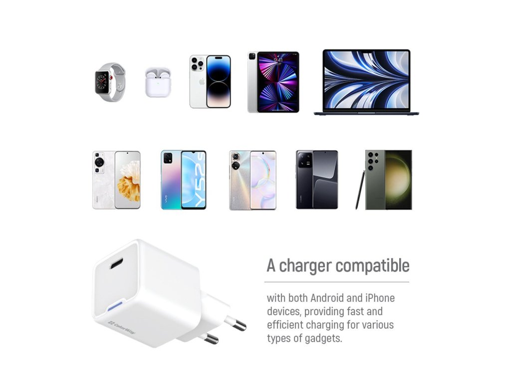ColorWay CW-CHS052PDC-WT – z 0 na 100 za pár okamihov Názov Kompaktná nabíjačka ColorWay CW-CHS052PDC-WT, ktorá v sebe skrýva modernú technológiu na napájanie vašich zariadení. Budete príjemne prekvapení výkonom tejto nenápadnej kostky. Podporuje rýchle napájanie s maximálnym výkonom 25 W av spojení s celou radou rýchlonabíjacích protokolov zvládne možné aj nemožné. Zoznam Nabíjačka ColorWay CW-CHS052PDC-WT poskytuje celkový výstupný výkon 25 W. Vďaka tomu dobijete svoje zariadenie počas popoludňajšej prestávky. Rozhranie USB-C je ideálne pre širokú škálu najnovších zariadení, ako sú smartfóny, tablety, prenosné herné konzoly, notebooky atď. Medzi podporované technológie patrí GaN, ktorá poskytuje vyšší výkon pri nižšej produkcii tepla. Zabudovaný čip Auto-ID detekuje pripojené zariadenia a optimalizuje dodávku energie, aby sa zabránilo nadmernému prúdu, prepätiu a neúmyselnému poškodeniu zariadenia. Vďaka nízkej hmotnosti a malým rozmerom sa nabíjačka ľahko prenáša v taške alebo batohu. ColorWay CW-CHS052PDC-WT Kompaktná nabíjačka GaN s podporou všetkých moderných protokolov rýchleho nabíjania. ColorWay GaN Mini je moderná kompaktná nabíjačka využívajúca pokročilú technológiu GaN (nitrid galia), ktorá poskytuje menšie rozmery, nižšiu hmotnosť a vyššiu účinnosť ako tradičné adaptéry. S maximálnym výkonom 25 W a podporou najnovších protokolov rýchleho nabíjania vrátane PD 3.0 PPS, Apple Fast Charge a Quick Charge 4.0+ ponúkajú optimálne riešenie na každodenné nabíjanie a cestovanie. Vďaka inteligentnému čipu AUTO-ID nabíjačka automaticky rozpozná pripojené zariadenie a zvolí optimálne napätie a proud až do 3 A, čím zabezpečí najefektívnejšie nabíjanie. Telo vyrobené z ohňovzdorného ABS plastu je odolné voči poškriabaniu a nárazom, čo zaručuje spoľahlivosť a odolnosť aj pri intenzívnom používaní. Vďaka kompaktným rozmerom 73 × 34 × 32 mm a hmotnosti ľan 52 g sa ľahko vedia do kapsy alebo tašky. Technológia GaN pre kompaktné rozmery a vyššiu účinnosť Maximálny výkon 25 W na rýchle nabíjanie moderných zariadení Podpora všetkých kľúčových protokolov rýchleho nabíjania (PD 3.0, PPS, QC 4.0+, Apple FDodatočné parametre