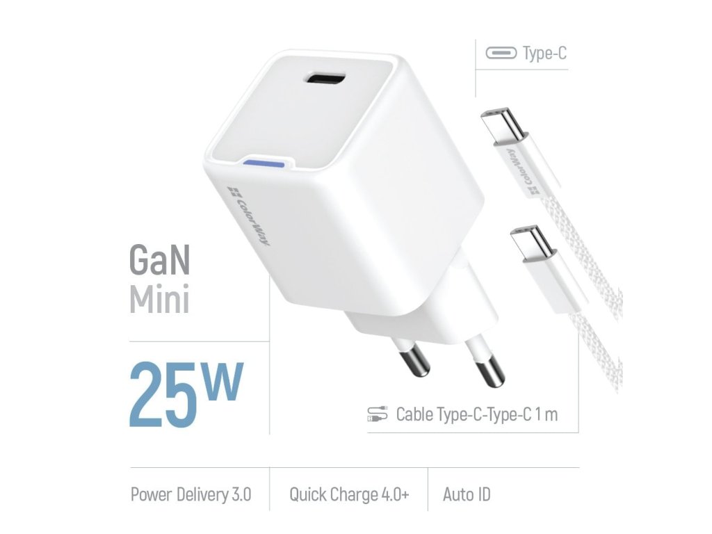 ColorWay 1x USB-C/ sieťová nabíjačka/ GaN/ PD/ PPS/ 25W/ 100cm kábel v balení/ biela