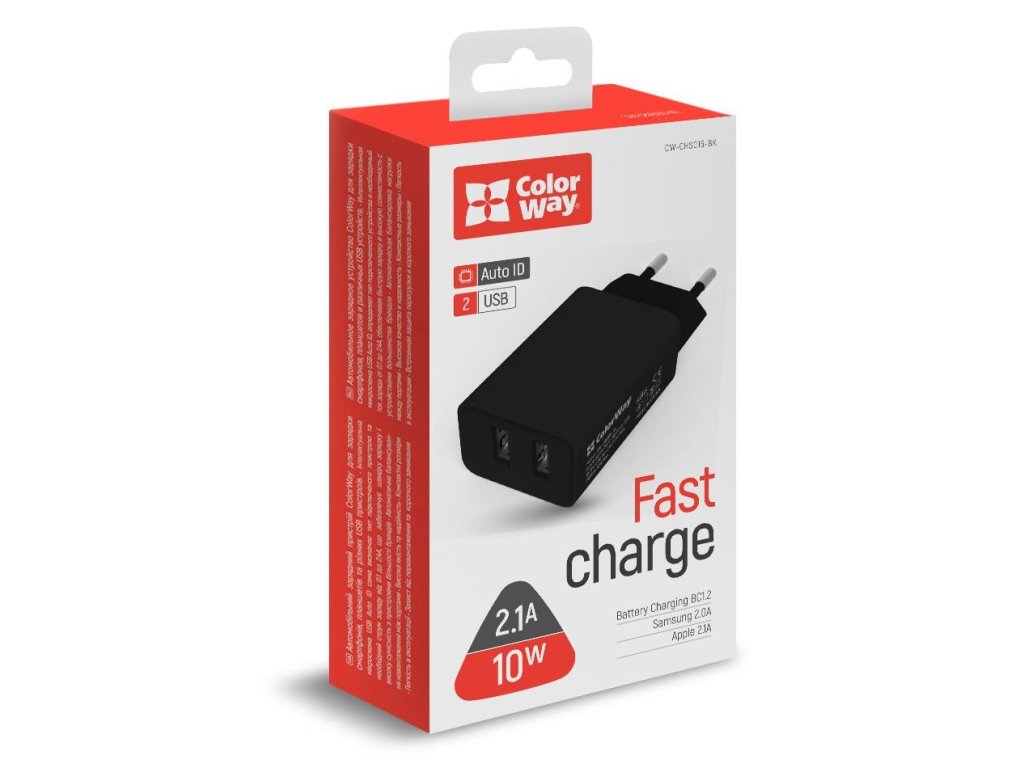 ColorWay CW-CHS015-BK Napájací adaptér s dvoma výstupmi USB a celkovým výkonom až 10 W. Technológia Auto ID rozpozná typ pripojeného zariadenia a zabezpečí správny nabíjací proud. Nabíjačka podporuje protokoly Battery Charging BC1.2, Samsung 2.0 A a Apple 2.0 A. ZÁKLADNÉ ŠPECIFIKÁCIE Konektor: 2× USB Vstup: AC 100-240 V Maximálny výstupný výkon: 10 W Výstup: 2× USB - DC 5 V / 2,1 A (s)Dodatočné parametre