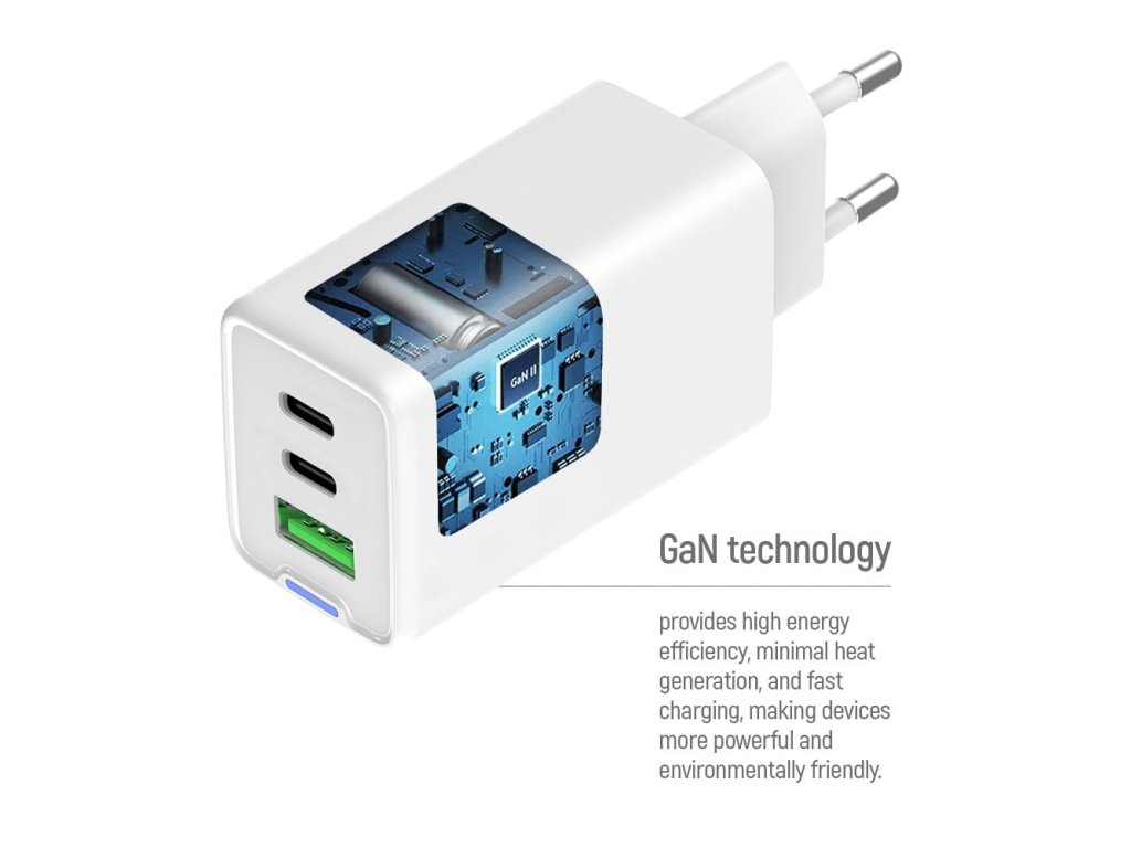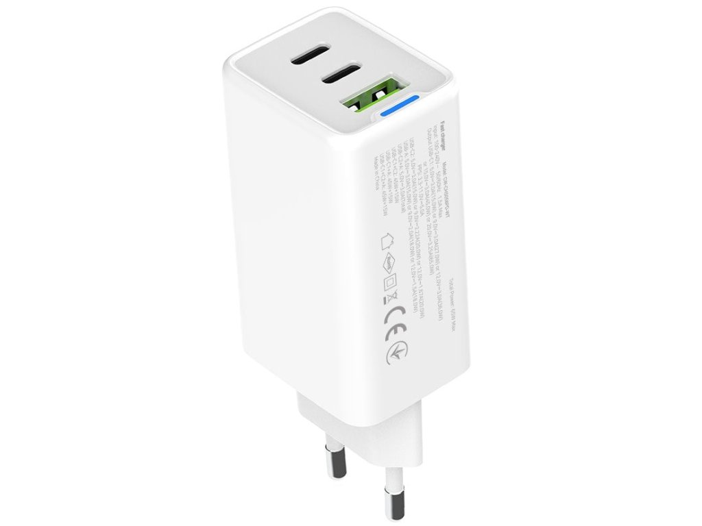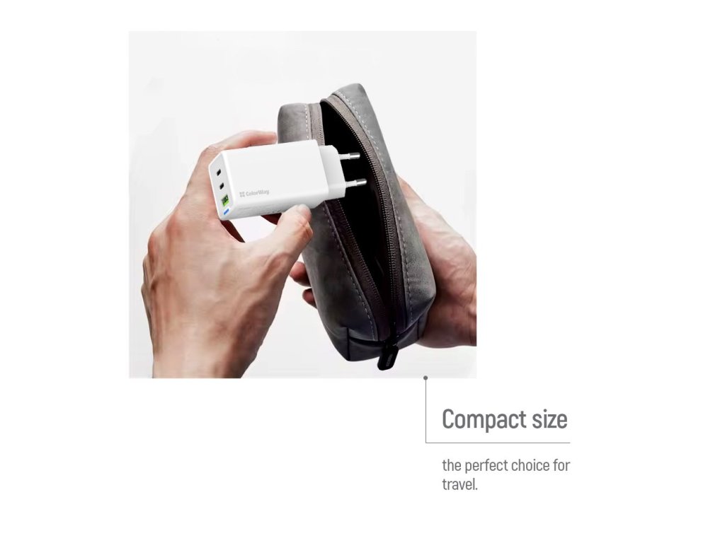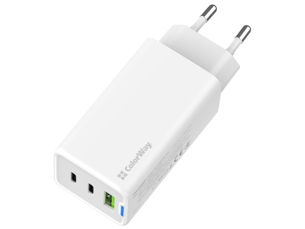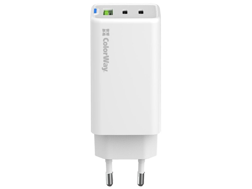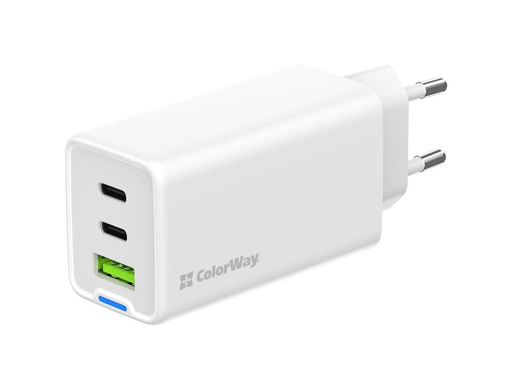 ColorWay 2x USB-C, 1x USB-A/ Sieťová nabíjačka/ GaN/ PD/ PPS/ 65W/ 2x káble v balení, USB-C-USB-C, USB-C-Lightning/ Biela