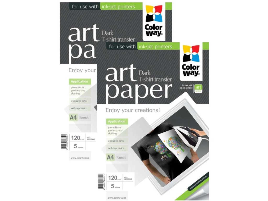Výtvarný papier ColorWay 2 × 5 ks Špeciálny papier na inkoustový tlač, ktorý umožňuje prenášať vytlačené obrázky na ľahké bavlnené textílie pomocou žehličky alebo termolisu. Na tlač sa odporúča používať pigmentový inkoust. Súčasťou balenia sú dve balenia po 5 papierov. ZÁKLADNÉ ŠPECIFIKÁCIE Formát: A4 Typ papiera: nažehľovací Hmotnosť: 120 g/m2 Počet kusov v balení: 10Dodatočné parametre