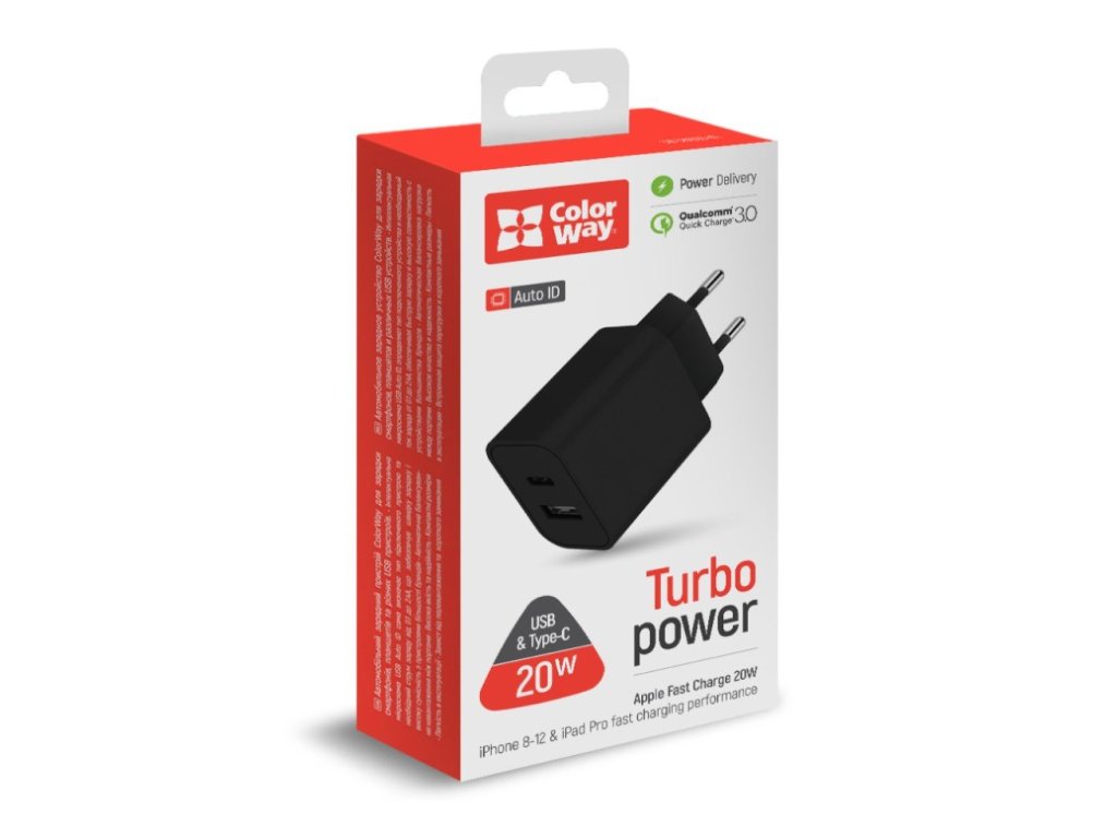 Napájací adaptér ColorWay USB a USB-C 20 W Napájací adaptér s výstupom 1x USB typu A a 1x USB typu C, podporou rýchleho nabíjania Quick Charge 3.0 a výstupným výkonom 20 W. Technológia Auto ID určuje typ pripojeného zariadenia a zabezpečuje správny nabíjací proud. Nabíjačka podporuje protokoly PD 20 W (Power Delivery), Apple Fast Charge 20 W, Huawei SCP/FCP, Quick Charge 2.0 a 3.0 a Samsung AFC Fast Charging. ZÁKLADNÉ ŠPECIFIKÁCIE Konektor: 1x USB typu A, 1x USB typu C Vstup: AC 100-240 V Maximálny výstupný výkon: 20 W Výstup: 20 W: 3 A, 9 V / 2,22 A, 12 V / 1,66 A Farba: čiernaDodatočné parametre