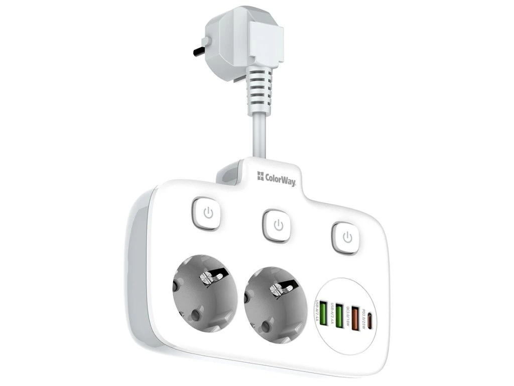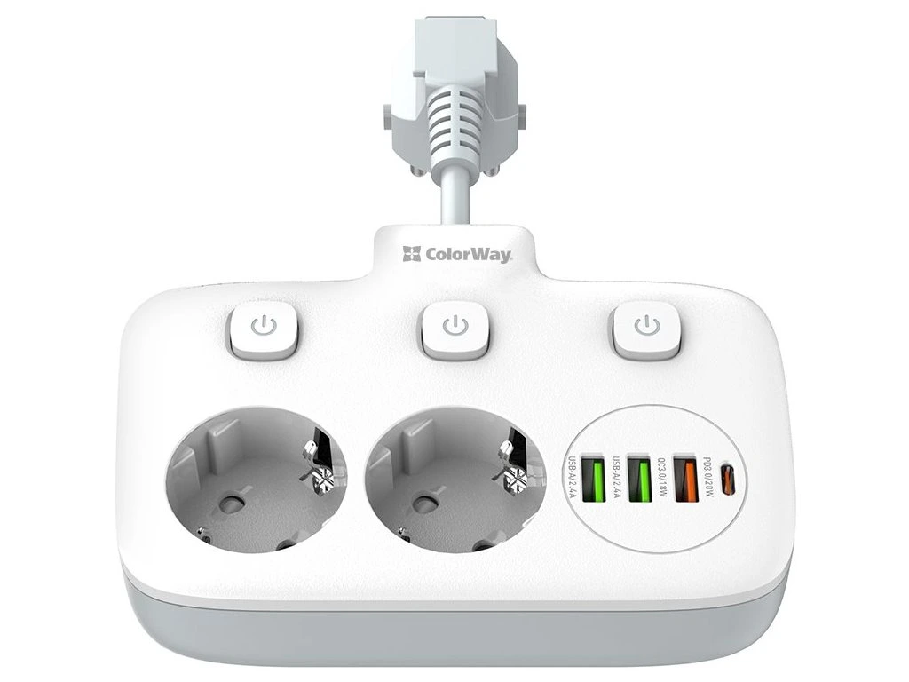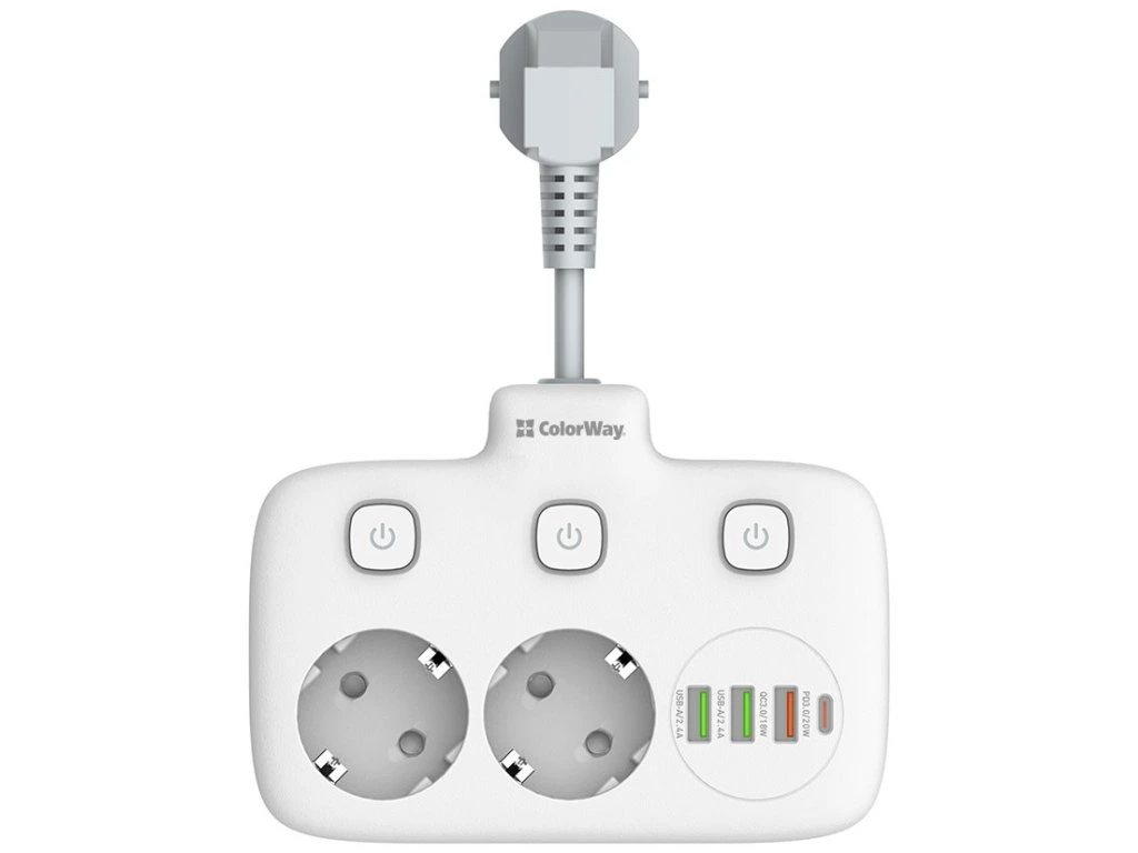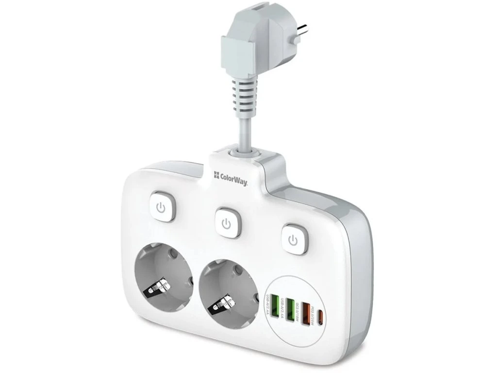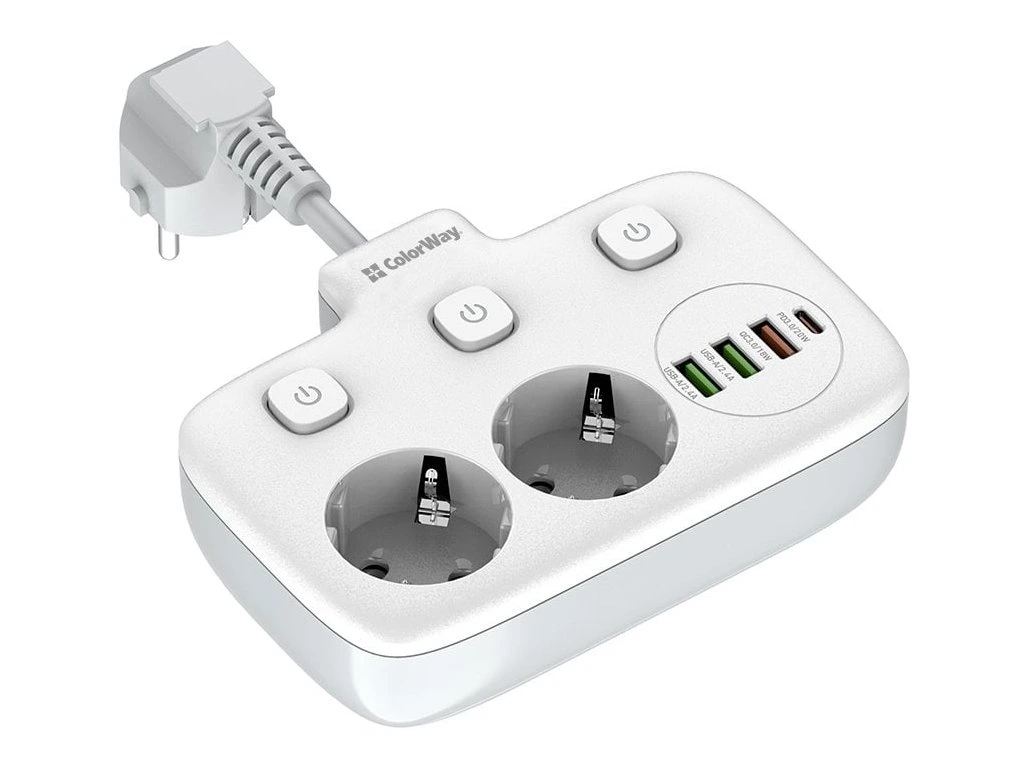 ColorWay CW-CHE24PDW Kompaktný predlžovací kábel s dvoma zásuvkami Schuko, tromi portami USB a jedným konektorom USB-C. Možno ho preto použiť nielen na pripojenie elektrických spotrebičov, ale aj na nabíjanie až štyroch mobilných zariadení súčasne z portov USB. Funkcia Auto ID automaticky rozpozná typ pripojeného zariadenia a určí vhodný nabíjací proud. Medzi podporované nabíjacie protokoly patria PD 2.0/3.0 PPS, Quick Charge 2.0/3.0, Apple Fast Charge, Huawei FCP, Samsung SFC/AFC a Xiaomi Turbo charge. Zásuvky a výstupy USB sú vybavené praktickým tlačidlom zapnutia/vypnutia. Telo napájacieho zdroja je vyrobené z tepelne odolného plastu, ktorý vydrží teploty až do 850 °C. Samozrejmosťou je uzemnenie a prepätová ochrana. ZÁKLADNÉ TECHNICKÉ ÚDAJE Menovitý preud: 10 A Menovité napätie: 250 V Počet zásuviek: Počet zásuviek: 2× zásuvka Schuko 2× USB: 5 V/2,4 A 1× USB: 5 V/3 A, 9 V/2 A, 12 V/1,5 A 1× 12 V/1,67 A Dĺžka kábla: 2,5 cm Rozmery: 148 × 108 × 33 mm Farba: bielaDodatočné parametre
