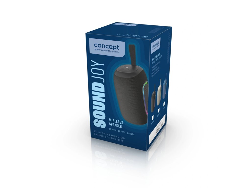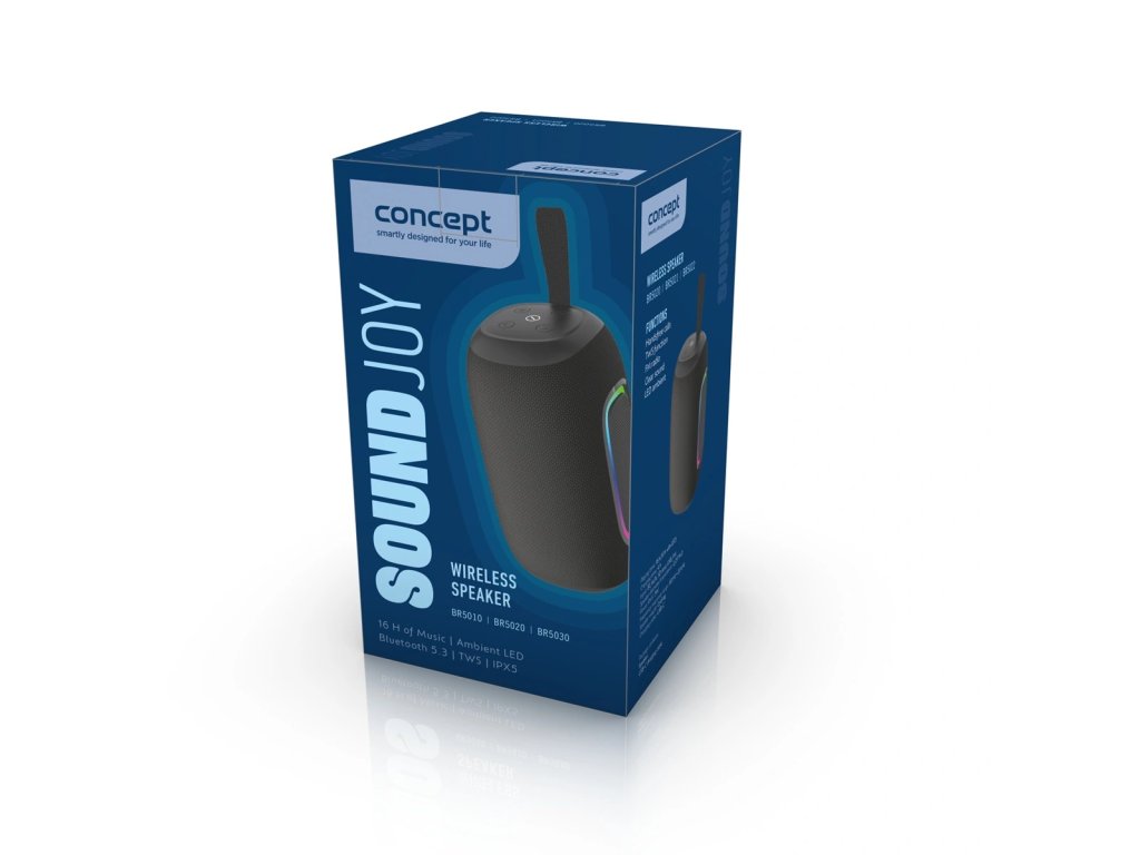 Kompaktní, ale výkonný reproduktor SoundJoy Concept BR5020 s výkonem 20 W naplní hudbou každý prostor. Kompaktní rozměry a lehká konstrukce umožňují mít ho neustále u sebe – snadno se vejde do tašky nebo batohu. Přenosný reproduktor s odolností IPX5 se nebojí vody ani prachu, takže je ideální na piknik, grilovačku nebo letní relax u bazénu. Výdrž, která vás nadchne Reproduktor SoundJoy BR5020 vás i přes své kompaktní rozměry dokáže pořádně rozhýbat. Při vysoké hlasitosti kolem 70 % hraje až 14 hodin bez světel a 12 hodin s LED efekty, ověřeno při reálném používání. Pokud si chcete hudbu užít v klidu doma, vydrží hrát až 17 hodin při nižší hlasitosti. Výkonná vestavná baterie zajišťuje dlouhý a nepřerušovaný hudební zážitek – ať už jste kdekoli. Stylové LED osvětlení Reproduktor SoundJoy Concept BR5020 nabízí 4 režimy ambientního LED osvětlení. Světla vytvoří skvělou atmosféru doma i venku – při klidném večeru nebo na večírku s přáteli. Pokud chcete šetřit baterii, můžete osvětlení jednoduše vypnout nebo přepnout do jednobarevného režimu. Reproduktor pro každou příležitost S bezdrátovým reproduktorem SoundJoy Concept BR5020 si hudbu užijete kdykoliv a kdekoliv. Rychlé a stabilní připojení přes Bluetooth 5.3 a možnost přehrávání přes AUX, TF kartu či USB zajišťují maximální flexibilitu při poslechu doma, venku i na cestách. Praktickou výhodou je handsfree volání, díky kterému můžete pohodlně vyřídit telefonát, aniž byste sahali po mobilu. Navíc BR5020 poslouží i jako powerbanka, takže si snadno dobijete telefon nebo jiné zařízení, i když jste mimo domov. TWS: hudba, která vás obklopí S funkcí TWS (True Wireless Stereo) můžete propojit dva stejné reproduktory (BR5020, BR5021 nebo BR5022) do jednoho výkonného stereo systému. Výsledkem je plnohodnotný prostorový zvuk, který vás obklopí ze všech stran a přinese skutečně dynamický hudební zážitek. Rádio vždy po ruce Pro poslech FM rádia stačí připojit AUX kabel s 3,5mm jackem, který funguje jako anténa, a naladit oblíbenou stanici. S reproduktorem SoundJoy Concept BR5020 máte rádio vždy po ruce. Technické parametry: Maximální výdrž baterie: 17 h Výdrž baterie při 70% hlasitosti: 14 h (12 h se zapnutým LED) Doba nabíjení: 5 h Baterie: 3.7 V 3600 mAh Výkon: 20 W Ambient LED (4 režimy) Voděodolnost: IPX5 Handsfree volání Jednoduché ovládání Funkce TWS Funkce powerbanky Bluetooth: 5.3 5 vstupů (BT, AUX, TF card, USB, FM rádio) Průměr měniče/impedance: 2x2 25“/4 ? stereo Frekvenční rozsah: 60 Hz — 20 kHz Hmotnost reproduktoru: 0,96 kg Typ nabíjení: USB-C (5 V, 2 A) Barva: černáDodatočné parametre