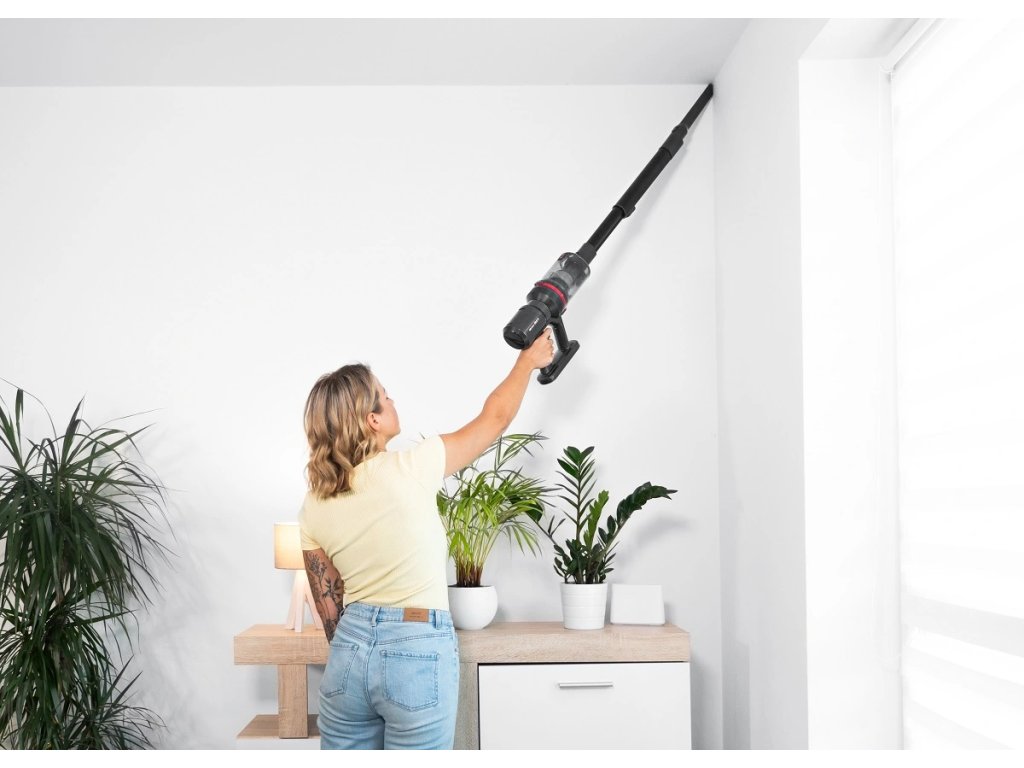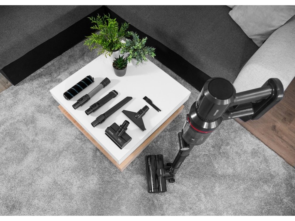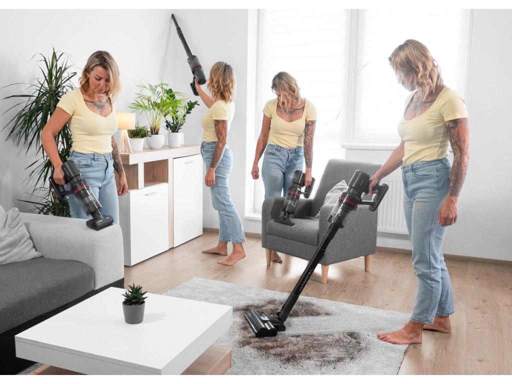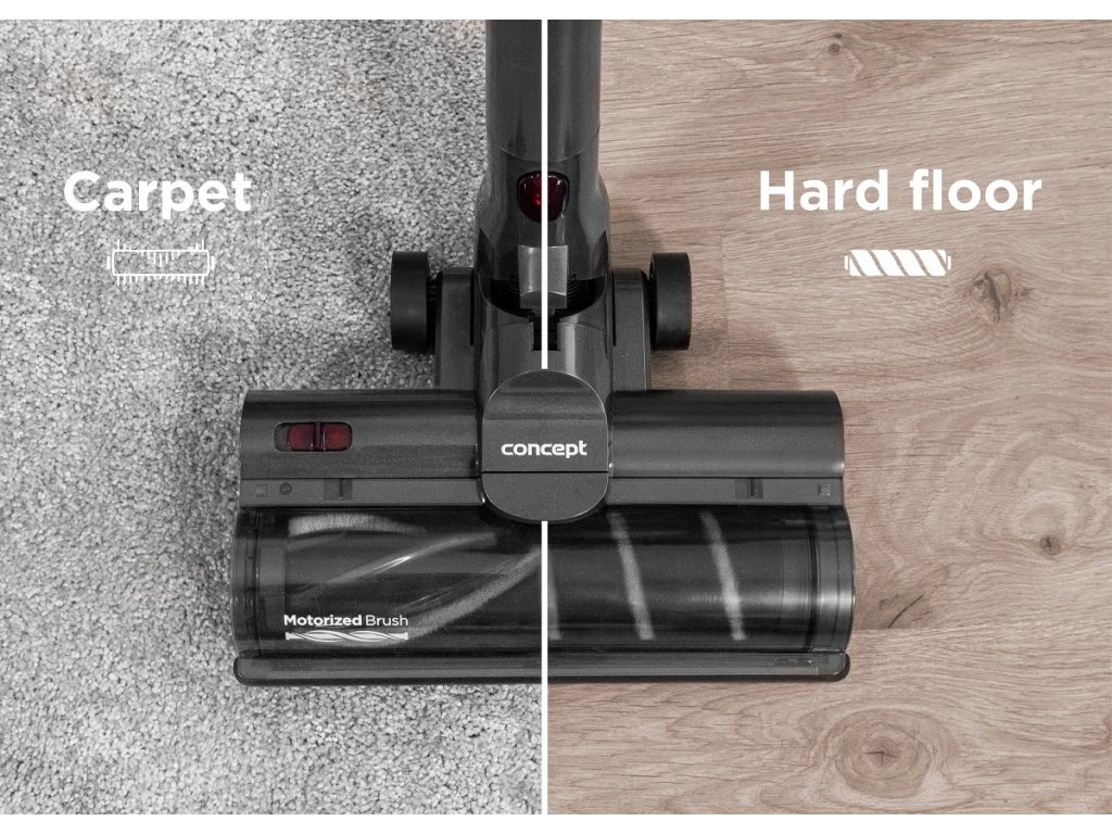 Tyčový vysávač 3 v 1 Ultimate UV Power 29,6 V Concept VP6150 Multifunkčný tyčový vysávač, ktorý sa prispôsobí každému používateľovi Tyčový vysávač Concept VP6150 3 v 1 Ultimate UV Power 29,6 V je multifunkčný vysávač, ktorý sa prispôsobí potrebám doslova každého používateľa. Ponúka širokú škálu príslušenstva, z ktorého si môžete zostaviť vysávač podľa svojich aktuálnych potrieb. Ľahko ho môžete premeniť na ručný vysávač a UVC sterilizátor. Dokáže vyčistiť všetky podlahy, schody, ťažko prístupné miesta, priestory bez elektrickej zásuvky alebo interiér auta. Špecifikácie: - Vysávač na vysávanie a čistenie, ktorý sa používa na vysávanie a čistenie: 3 v 1: tyčový vysávač, ručný vysávač, UVC sterilizátor Sací výkon: 27 kPa (130 aW) Motor BLDC 3 pracovné režimy: nízky, stredný, vysoký Objem nádoby na prach: 470 ml Odnímateľná Li-Ion batéria, 2200 mAh Napätie batérie: 29,6 V Maximálny čas vysávania: 50 minút (v režime MIN) Čas nabíjania: 3 - 4 hod. Indikátor stavu nabitia batérie (v percentách) Teleskopická trubica Veľká turbo kefa Zámok turbokartáča - vysávač stojí na svojom mieste HEPA filter H13 Výkon: 500 W Hlučnosť: <85 dB Hmotnosť: 2,9 kg Farba: čierna Vrátane príslušenstva: Flexibilný ohybný nadstavec v hornej časti vysávača = až 2x väčší dosah pod nízkym nábytkom v porovnaní s bežnými flexi trubicami UVC malá turbo kefa Kefa na tvrdé podlahy Kefa na koberce Flexibilná flexi hadica Štrková hubica Štrková tryska s kefou Hubica na čalúnenie Napájací adaptérDodatočné parametre