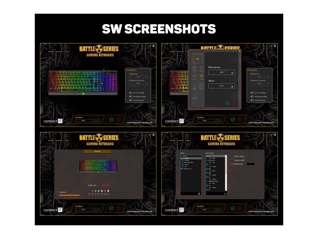 Battle RGB, čierna --- Profesionálna herná klávesnica série Battle pre hráčov PC hier v českom a slovenskom rozložení s celkovo 11 režimami RGB podsvietenia a sedemstupňovou reguláciou intenzity podsvietenia. K dispozícii je 12 multimediálnych klávesov, bohatý softvér a pozlátený USB konektor. Dodáva sa s hernou promo nálepkou "Battle Series". --- Okrem štandardných funkcií ponúka 26 klávesov anti-ghost, ktoré zabraňujú nesprávnej interpretácii pri stlačení viacerých klávesov naraz. Užívateľský softvér, ktorý posúva všestrannosť tejto klávesnice na vyššiu úroveň, je k dispozícii na stiahnutie úplne zadarmo na adrese www.connectit-europe.com. Pomocou uvedeného softvéru môžete vytvárať užívateľské makrá, meniť podsvietenie a preprogramovať klávesy podľa svojich potreb, pričom všetky tieto funkcie možno uložiť do 5 rôznych profilov. Táto séria sa samozrejme dodáva s prémiovým opleteným napájacím káblom a pozláteným konektorom USB. --- Určené pre profesionálnych aj amatérskych hráčov počítačových hier Storm (6 rýchlostí a 7 úrovní intenzity) - efekt celej obrazovky pripomínajúci putujúcu kométu. Smer a farbu možno nastaviť v softvéri. - Againts the Stream (6 rýchlostí a 7 úrovní intenzity) - farebný efekt celej obrazovky kombinujúci statickú farbu a vlnu postupujúcej farby. Smer a farbu možno nastaviť v softvéri. - Prúd vody (6 rýchlostí a 7 úrovní intenzity) - farebný efekt vlny. Smer a farbu možno nastaviť v softvéri. - Blitz (6 rýchlostí) - úplný efekt blikajúcich 2 farieb, ktoré sa časom menia na rôzne farby. Farby, ktoré sa objavia v tomto efekte, je možné zmeniť v softvéri. - Osem nebeských nádychov (6 rýchlostí) - celoobrazovkový efekt dýchania, ktorý mení farbu po každom ôsmom "nádychu". Farby, ktoré sa objavia v tomto efekte, je možné zmeniť v softvéri. - Static RNBW - statický efekt RNBW s podsvietením celej obrazovky - fialová, červená, zelená a modrá. - Breathing (6 rýchlostí) - celoobrazovkový farebný efekt dýchania s možnosťou výberu farieb pomocou softvéru. - Trigger (6 rýchlostí a 7 úrovní intenzity) - celoobrazovkový efekt, ktorý sa spustí po stlačení klávesu. Farbu, smer a typ reakcie možno nastaviť v softvéri. - Neon (6 rýchlostí) - celoobrazovkový efekt meniacich sa farieb. - RNBW Flow (6 rýchlostí) - celoobrazovkový efekt prelínania farebných vln. Smer efektu možno meniť v softvéri. Statické monochromatické podsvietenie s 1 režimom: - Farba (7 úrovní intenzity) - podsvietenie celej obrazovky v jednej zo šesť farieb (červená, modrá, zelená, fialová, tyrkysová, žltá alebo biela). Farbu možno zmeniť pomocou tlačidla FN + Insert alebo nastaviť v softvéri. Podsvietenie možno úplne vypnúť Ovládanie rýchlosti efektu RGB v 6 krokoch Ovládanie intenzity svetla v 7 krokoch Softvér umožňuje: - vytváranie užívateľských profilov - prepínanie medzi užívateľskými profilmi - vytváranie užívateľských makier - prepínanie LED podsvietenia klávesnice s možnosťou jeho úplného vypnutia - úpravu klávesov 12 multimediálnych kláves: - (zvýšenie) - stlmenie (hlasitosti) - stop - predchádzajúca skladba - prehrávanie/pauza - ďalšia skladba - e-mail - domovská stránka prehliadača - uzamknutie celej klávesnice - kalkulačka Win-Lock (blokovanie klávesov systému Windows počas hrania hier, aby sa zabránilo nechcenému vyvolaniu klávesov 26 Anti-ghost klávesov na zabránenie nesprávnej interpretácii stlačenia viacerých klávesov naraz Prémiový opletený napájací kábel Pozlátený konektor USB pre maximálnu konektivitu Jednoduchá inštalácia Plug & Play Univerzálna kompatibilita s operačnými systémami Windows a Mac OS (funkcie produktu nepodporované operačným systémom Mac OS nemusí fungovať (d × v × š): 470 x 165 x 35 mm Hmotnosť vrátane kábla: 638 g --- Balenie obsahuje: Klávesnica Návod na obsluhu Propagačná nálepka "Battle Series"Dodatočné parametre