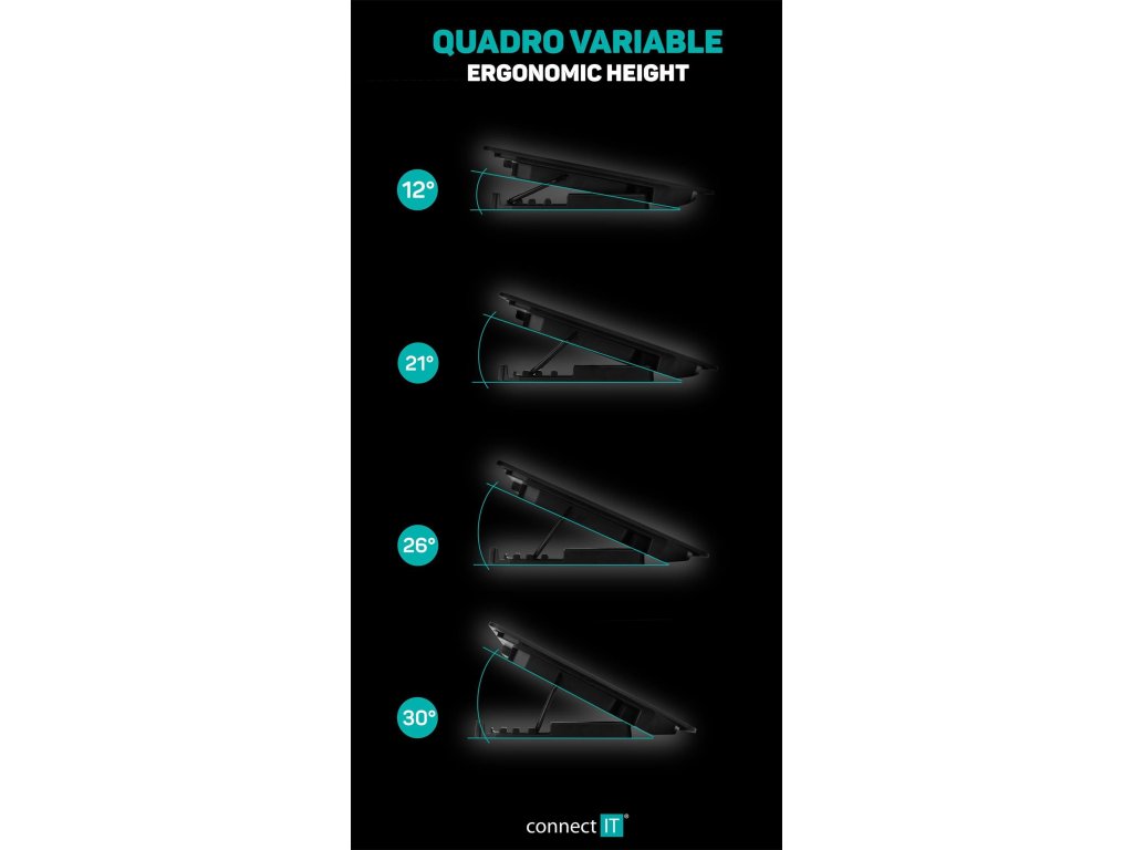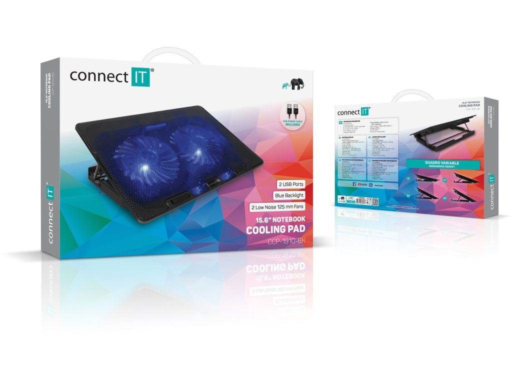 FrostBreeze BLACK --- Chladiaca podložka pod notebook CONNECT IT "FrostBreeze" CCP-1910-BK s dvoma ventilátormi s modrým LED podsvietením, celokovovou chladiacou mriežkou a štvorpolohovým nastavením výšky. Kompatibilná s notebookmi s uhlopriečkou do 15,6". --- Podložka zabezpečuje odvod tepla z notebooku a jeho vetracích otvorov, ako aj priame chladenie plášťa notebooku prostredníctvom cirkulácie chladného vzduchu, čím zlepšuje celkový výkon notebooku. Vďaka kompaktným rozmerom je ideálna na prácu doma av kancelárii, ako aj na cestovanie a časté prevedenie. nebude rušiť ani pri najnáročnejšej práci vyžadujúcej si maximálne sústredenie. Rýchlosť 2 ventilátorov je možné ovládať pomocou posuvného kolesa. (12°, 21°, 26° a 30°) Celokovová chladiaca mriežka Jednoduchá inštalácia - stačí pripojiť dodaný kábel USB-A k notebooku a ďalších zariadení (napr. mobilného telefónu alebo powerbanky) Ktorýkoľvek zo vstupov USB možno použiť na nabíjanie napr. mobilného telefónu, aj keď je podložka vypnutá hlavným vypínačom 2 veľké ventilátory (2x 12,5 cm) Modré LED podsvietenie 1000 otáčok za minútu Hladina hluku: 20 dBA (5 V DC) Napájací kábel USB-A je súčasťou dodávky (dĺžka 55 cm) Materiál: plast + kov Rozmery (Š × V × H): 355 × 255 × 30 mm Hmotnosť: 667 g Farba: čierna --- Obsah balenia: Chladiaca podložka Napájací kábel USB-ADodatočné parametre