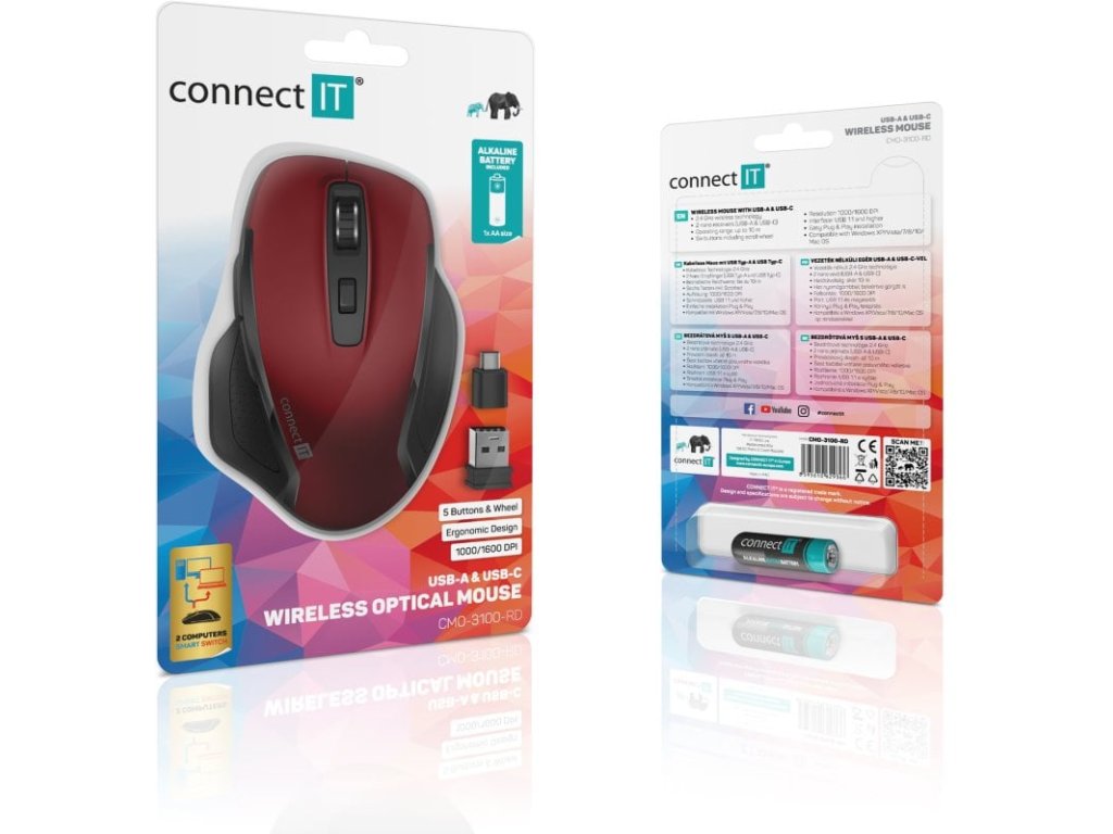 Duálny prepínač SmartSwitch RED --- Kancelárska bezdrátová myš s dvoma prijímačmi USB Nano (USB-A a USB-C), šesť tlačidiel a presným senzorom. --- Bezdrôtová optická myš s jedinečnou funkciou SmartSwitch, ktorá umožňuje používať myš striedavo na dvoch počítačoch alebo notebookoch a volne medzi nimi prepínať. Táto funkcia je vhodná pre domáce a profesionálne kancelárske prostredie, kde sa jedna myš používa striedavo na dvoch počítačoch alebo notebookoch. Jedinečná konštrukcia myši umožňuje uložiť oba prijímače USB Nano pod kryt priestoru na batérie v spodnej časti myši, čím sa zabráni ich strate. Súčasťou balenia je originálna alkalická ceruzková batéria CONNECT IT. --- Určená na domáce a kancelárske profesionálne použitie Bezdrôtová technológia 2,4 GHz Technológia Dual Smart Switch (dva bezdrôtové prijímače USB Nano) Dosah prijímača až 10 m Rozhranie: - USB-A 2.0 spätne kompatibilný s USB 1.1 - USB-C (typ C) používanie Optický snímač Rozlíšenie: 1000/1600 DPI Vysoká presnosť ideálna aj na prácu v grafických editoroch Jednoduchá inštalácia Plug & Play bez potreby inštalácie a sťahovania ovládačov (stačí pripojiť prijímač USB k portu USB počítača alebo notebooku) Mechanické spínače s garantovanou životnosťou oba prijímače USB Nano ideálne na prepravu a cestovanie Napájanie: 1 × alkalická ceruzková batéria AA originál CONNECT IT (je súčasťou dodávky) Kompatibilný s operačnými systémami Windows XP/Vista/7/8/10/ a Mac OS X (funkcie produktu nepodporované systémom Mac OS X nemôžu fungovať správne) Rozmery mm Hmotnosť bez batérie a bez prijímačov USB: 73 g Hmotnosť s bateriou a bez prijímačov USB: 97 g Farba: čierna --- Obsah balenia: Myš USB-A nano prijímač USB-C nano prijímač Originálna tužková batéria CONNECT ITDodatočné parametre