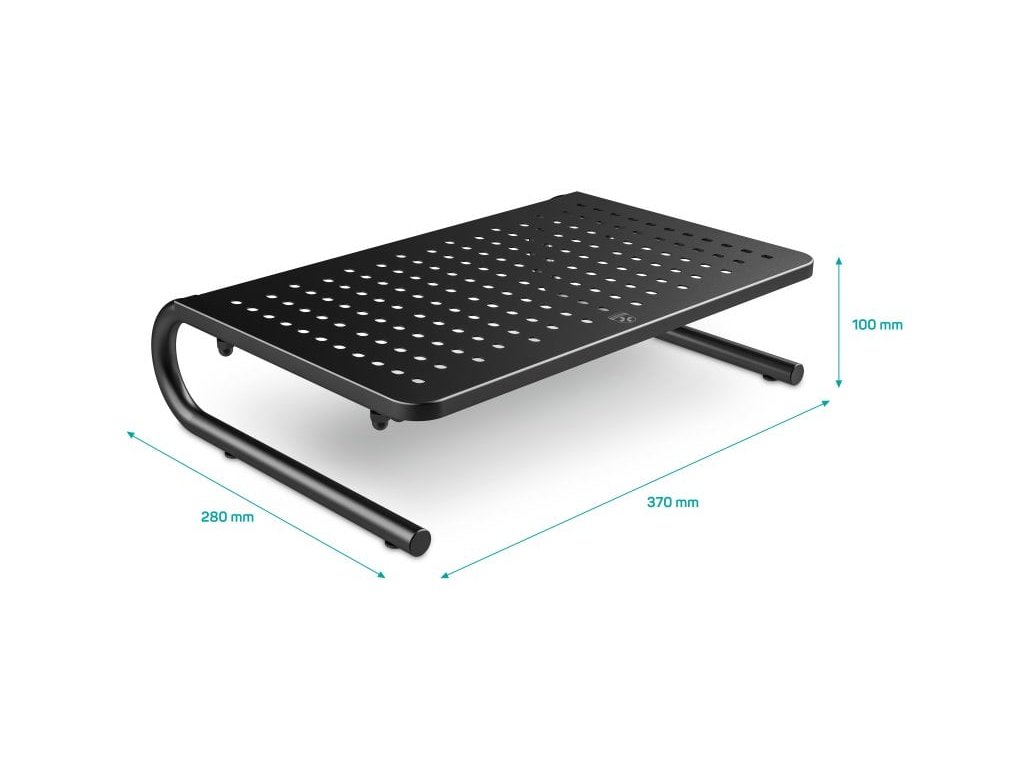 SteelBase BLACK --- Multifunkčný kovový stojan je ideálny pre všetky monitory, notebooky a iné zariadenia. Stojan ponúka jednoduchý, ale elegantný design, ktorý ľahko zapadne do každej kancelárie alebo interiéru. Špeciálna perforovaná konštrukcia stojana zabezpečuje odvod horúceho vzduchu od notebooku, aby sa neprehrieval. --- Poskytuje optimálnu výšku monitora a znižuje zaťaženie krčnej pátere a následné bolesti zad pri dlhodobej práci s počítačom. Priestor pod stojanom možno využiť ako rozšírenú pracovnú plochu na odkladanie dokumentov, kanceláriských potreb atď. --- Technické špecifikácie: Materiál: ocel Rozmery: 370 x 280 x 100 mm Maximálne zaťaženie: 20 kg 4 protišmykové gumené podložky Stojan na monitor/notebook PríručkaDodatočné parametre