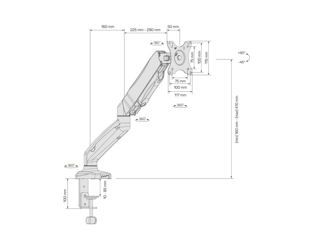 Univerzálne držiaky monitorov značky CONNECT IT sa vďaka svojej povestnej kvalite a šírke ponuky radia medzi súčasnú špičku v obore. Záruka na vybrané modely je 30 rokov. Vyznačujú sa kvalitnými materiálmi, precíznym dielenským spracovaním a jednoduchou montážou. Nestretnete sa u nich s vôľou v kĺboch ani nepríjemným vŕzganím. Všetky TV držiaky sú testované na trojnásobok uvádzanej nosnosti. Univerzálny držiak CONNECT IT SingleArm na 1 monitor so zárukou 30 rokov Min. uhlopriečka monitora: 13" (33 cm) Max. uhlopriečka monitora: 32" (80 cm) Kompletný zoznam podporovaných rozstupov VESA: VESA 75×75 VESA 100×100 Výškovo nastaviteľný (stred VESA uchytenie až do výšky 41 cm) Pre dosky stolov vďaka 6 pohyblivým kĺbom Špeciálny systém pružinového paralelogramu umožňuje nezávislé nastavenie monitorov do akejkoľvek polohy bez použitia náradia a bez akéhokoľvek uťahovania (stačí iba rukou zmeniť pozíciu monitora a ten sa vďaka špeciálnej pružine vo vnútri držiaka sám zafixuje v danej polohe) Náklon hore: 90° Náklon dole: 360° Maximálna nosnosť: 6,5 kg ICM systém (Invisible Cable Management) pre vedenie káblov vo vnútri držiaka Jedna zo svoriek má špeciálny úložný priestor pre úschovu montážneho náradia Hmotnosť držiaka: 2,3 kg Farba: čierny mat Materiál: oceľ Obsah balenia: Držiak Dve pätky pre rôzne spôsoby uchytenia obsluheDodatočné parametre