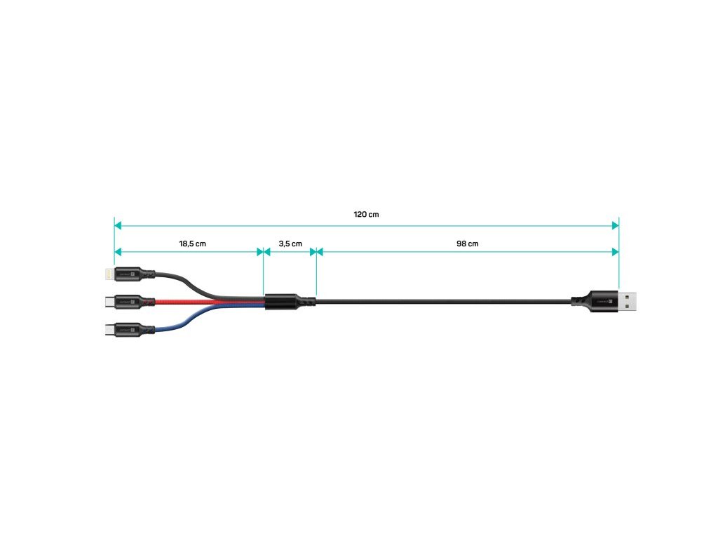 WIREZ 3v1, čierna --- Univerzálny nabíjací kábel 3v1 na nabíjanie zariadení s konektormi Micro USB, Lightning a USB-C (typ C) umožňuje nabíjať až tri zariadenia súčasne s podporou rýchleho nabíjania pomocou maximálneho prietoku prúdu 2 A. Špeciálne manžetové predĺženie konektorov Micro USB, Lightning a USB- mobilných telefónov v puzdrách. --- Špeciálne prémiové nylonové opletenie zaručuje vysokú flexibilitu a odolnost. Barevné rozlišovanie vetví konektora usnadňuje a urýchľuje jeho používanie. Všetky konektory sú uzavreté v pevnom puzdre z leteckého hliníka. Vysokokvalitný materiál jadra s dostatočným celkovým prierezom umožňuje rýchle nabíjanie. --- Celková dĺžka: 1,2 m Dĺžka jednotlivých vetví: 18,5 cm Konektory: - Micro USB - Blesk - USB-C (typ C, štandard USB 3.1 Gen 1) Maximálny preud: 2 A Certifikácia RoHS Farba: čierne prémiové opletenie s farebne označenými vetvami konektora (čierna, modrá a červená. Samsung, Huawei, Microsoft, LG, Xiaomi atď.) Kompatibilný so všetkými zariadeniami s portom Lightning (iPhone, iPad, iPod) Kompatibilný so všetkými zariadeniami s portom USB-C, niekedy označovaným ako USB-Type C (napr. Samsung, Huawei, Microsoft, LG, Xiaomi atď.)Dodatočné parametre