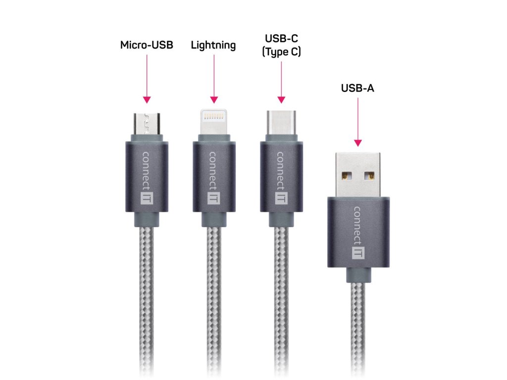 Connect IT Wirez 3v1 USB-C & microUSB & Lightning, strieborná sivá, 1,2 m