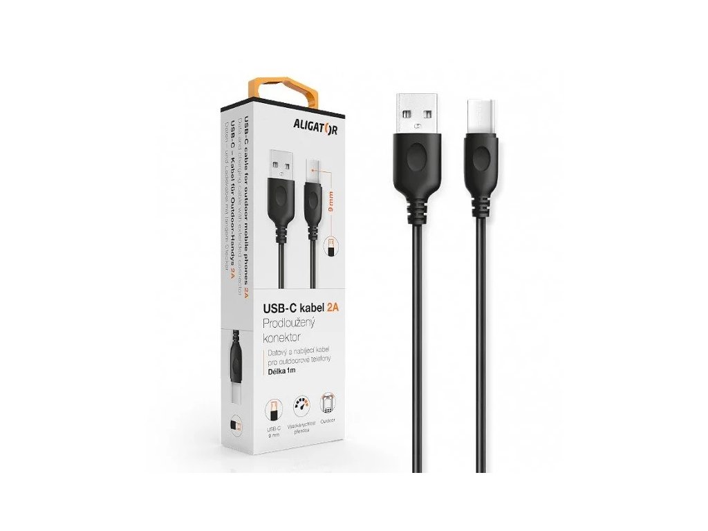Dátový a nabíjací USB-C kábel s predĺženým konektorom pre outdoorové telefóny ALIGATOR: Kábel sa vyznačuje extra dlhým USB-C konektorom na nabíjanie a synchonizáciu dát. Kábel je určený najmä pre outdoorové telefóny, pre ktoré je štandardná dĺžka USB-C konektora nedostačujúca. - vysoko kvalitné konektory - vysoká rýchlosť prenosu dát - možnosť rýchleho nabíjania 2A - predĺžený konektor 9mm - dĺžka: 1m - farba: čierna s bielaDodatočné parametre