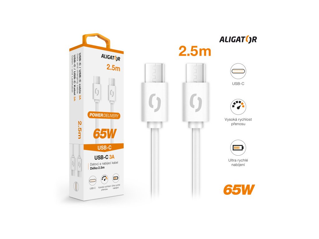 Dátový kábel ALIGATOR POWER 65W, USB-C/USB-C 3A, 2,5 m biely