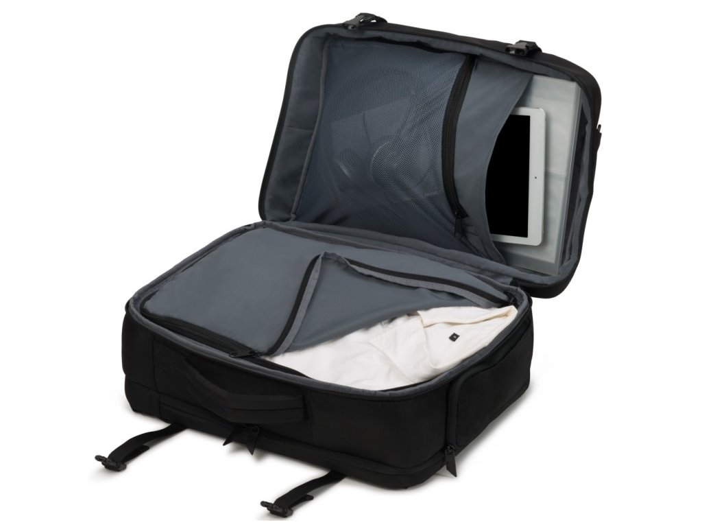 Batoh a taška v jednom je štýlovým riešením na prenášanie notebooku do veľkosti 15,6". Priehradka na notebook je polstrovaná, aby sa zabránilo prípadnému poškriabaniu. Elastický fixačný popruh ho navyše bezpečne udrží na mieste. K dispozícii je aj polstrovaná kapsa na tablet s veľkosťou do 10,5". Dôležité dokumenty a ďalšie nevyhnutné príslušenstvo môžete uložiť do priestranných vnútorných priehradiek. Ergonomický dizajn spolu s nastaviteľnými ramennými popruhmi zabezpečujú rovnomerné rozloženie hmotnosti a zabraňujú namáhaniu ramen a zad. ZÁKLADNÉ ŠPECIFIKÁCIE Pre notebooky: 13" - 15,6" Materiál: polyester Rozmery: 425 x 295 x 210 mm Vnútorné rozmery: 385 x 265 x 30 mm Hmotnosť: 1190 g Farba: čiernaDodatočné parametre