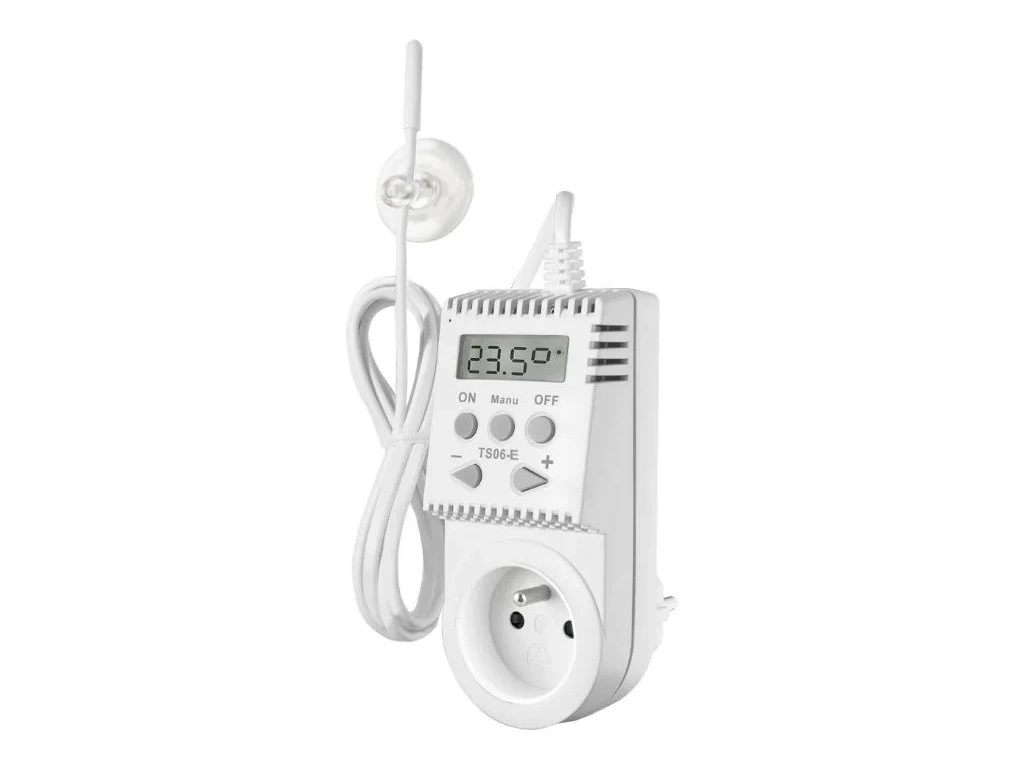 Vlastnosti tepelne spínanej zásuvky TS06-E: Rýchle nastavenie požadovanej teploty pomocou tlačidiel + a -. Výhody tepelne spínanej zásuvky TS06-E: vonkajší snímač s dĺžkou 1,6 m, možno použiť vo vode s maximálnou teplotou 70 °C jednoduchá obsluha funkcia trvalého vypnutia (OFF) regulácia teploty v krokoch po 0,5 °C ochrana proti zamrznutiu (3 °C) prehľadný displej Technické parametre Napájanie 2 (0,5 °C) Nastaviteľný teplotný rozsah 3 °C až 40 °C Nastavenie teploty v krokoch po 0,5 °C Min. indikačný skok 0, 5 °C Presnosť 0,5 °C Spínací prvok relé Výstup 16 A Záložná batéria Nie Stupeň krytia IP20 Prevádzková teplota 0 °C až 40 °CDodatočné parametre