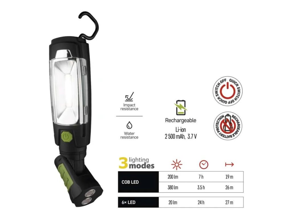Univerzálne pracovné svietidlo, ktoré si nájde svoje miesto v každej domácnosti, dielni a všade tam, kde potrebujete zaistiť širokú plochu osvetlenia. Možnosť uchytenia pomocou magnetu alebo háčika. Najdôležitejšie parametre: napájanie: Li-Ion akupack maximálny dosvit: 27 m maximálny svetelný tok: 380 lm Ostatné parametre: batéria súčasťou balenia: áno nabíjací: áno typ batérie: 2 500 mAh/3,7 V fokus: nie vodeodolnosť: áno COB LED 50 % – 7 h, COB LED 100 % – 3,5 h, LED 100 % – 24 h doba nabíjania: 4 h nárazuvzdornosť: áno farba: čierno-zelená svetelný tok: COB LED 50 % – 200 lm, COB LED 100 % – 3 svetlá: COB LED + LED dosvit: COB LED 50% - 19m, COB LED 100% - 26m, LED 100% - 27m počet režimov svietenia: 3 LED indikácia stavu akumulátora: neuvádza sa režimy svietenia: COB LED 50%, COB LED 100%, LED 100% napájací adaptér do siete, napájací adaptér do automobilu špeciálne funkcie: funkcia rýchleho vypnutia, funkcia ochrany batérie vybavenie otočná rukoväť, 1× hák, 2× magnet hmotnosť: 265 g záručná doba: 2 roky rozmer: 56 × 50 × 240 mmDodatočné parametre