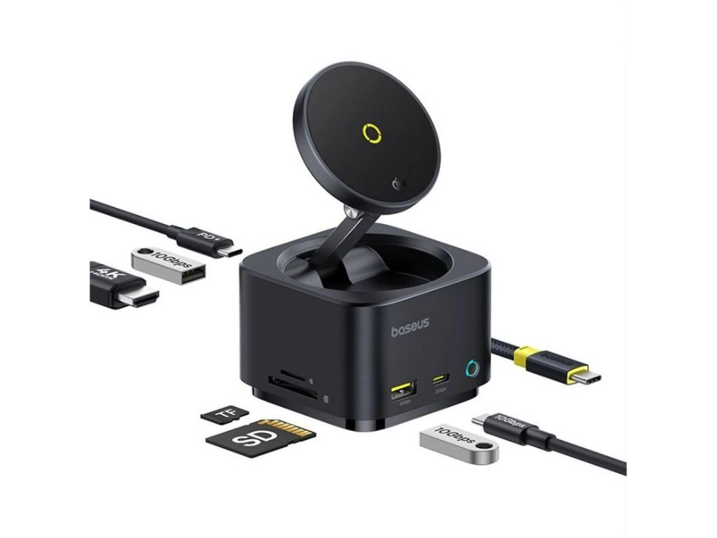 Baseus MagPro 7v1 HUB ponúka pohodlné magnetické bezdrôtové nabíjanie a množstvo pôsobivých funkcií. Vďaka 15 W nabíjaciemu výkonu a adaptéru USB-C na HDMI môžete svoje zariadenia jednoducho pripojiť k displeju s rozlišením 4K. Dva vysokorýchlostné porty USB-A (10 Gb/s) a ďalší port USB-C (10 Gb/s) zabezpečujú rýchly prenos dát a sloty na karty SD/TF vám umožnia prístup k dôležitým súborom. Navyše nabíjací port USB-C PD zabezpečí, že vaše zariadenie bude na cestách stále napájané. Vysokorýchlostné porty: Porty USB-A a USB-C s rýchlosťou až 10 Gb/s na extrémne rýchly prenos dát. port HDMI s podporou 4K pri 60 Hz na výnimočný obrazový výstup. Rýchle nabíjanie s výkonom 100 W: Dodávka energie cez USB-C, rýchle nabíjanie pre notebooky a iné zariadenia náročné na energiu. 15W bezdrôtové nabíjanie: Bezdrôtová nabíjacia podložka pre kompatibilné zariadenia, ktorá ponúka pohodlné a efektívne nabíjanie. Pripojenie viacerých zariadení: Podporuje súčasné pripojenie periférnych zariadení, ako sú disky USB, klávesnica a myš, na zlepšenie multitaskingu. Kompaktný a skladací design: Prenosný, priestorovo úsporný dizajn je ideálny na cestovanie alebo použitie v kompaktných pracovných priestoroch. Špecifikácia produktu: & nbsp;: & nbsp; V prípade potreby môžete použiť aj iné zariadenia, ako sú napríklad: 1 × HDMI (4K/60 Hz). 2 × USB-A (10 Gb/s). 1 × USB-C (10 Gb/s). 1 × USB-C (PD - 100 W). 1 × čítačka kariet SD/TF. Bezdrôtové nabíjanie s výkonom 15 W. Multifunkčný výkon: Nabíjajte, pripájajte a prenášajte dáta pomocou jedného zariadenia. Vysokorýchlostný prenos dať a rýchle nabíjanie. CPA CZECH sro, U Panasonicu 376, 53006 Pardubice - Staré Čívice, Česká republika, e-mail: cpa@cpa.cz, webová stránka: www.cpa.czDodatočné parametre