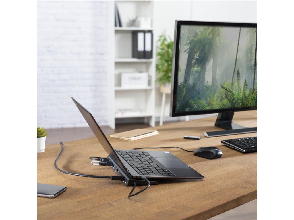 - Rozbočovač USB-C na pripojenie až 10 zariadení, pre širšie možnosti pripojenia k PC, notebooku, MacBooku, tabletu alebo ak sa má jedným pripojením pripojiť viacero zariadení - Veľký rozstup konektorov umožňuje pohodlné pripojenie viacerých zariadení - Superrýchly prenos dát až do 5 Gbit/s - Zásuvka USB-C podporuje prenos dát a nabíjania (USB Power Delivery4) 2160 pixelov) - Gigabitový ethernetový prenos dať do 1 Gbit/s - Praktické a pohodlné umiestnenie vďaka šikmému tvaru - Funkcia MST (Multi Stream Transport) na súčasné pripojenie až troch monitorov k počítaču / notebooku s rôznym obsahom - robustná hliníková konštrukcia s elegantným dizajnom - kabel s signálu - protišmykové nožičky - kompatibilný s rozhraním Thunderbolt 3.4 - Plug & Play, nie je potrebný žiadny softvér - Napájanie USB Pripojenie: - 4x USB-A: pre externý disk, USB flash disk, myš, klávesnicu, tlačiareň - 1x USB-C: pre externý disk, USB flash disk, myš, klávesnicu, tlačiareň napájací zdroj, PD power banku - 2x HDMI: na pripojenie monitora, TV, projektora - 1x DisplayPort: na pripojenie monitora, TV, projektora - 1x LAN/Ethernet: pre káblové pripojenie k internetu Systémové požiadavky: - Operačný systém: Windows 11/10/8/7 a Mac Os od 10.8 USB alebo Thunderbolt. Ak chcete pripojiť monitor cez HDMI alebo DisplayPort, zariadenie musí podporovať alternatívny režim DisplayPort alebo Thunderbolt 3,4. MST funguje cez HDMI alebo DisplayPort len v spojení s aktuálne operačnými systémami Microsoft Windows. Špecifikácia: - Pripojenie vidlice USB-C. - Štandard USB: USB 3.2 Gen 1 - Maximálny prenášaný výkon: 100 W - max. rozlišení: 4K (4096 x 2160 pixelov) - rýchlosť siete: 10/100/1000 Mb/s - Počet pripojení: 10 - Rozmery: 26,1 x 2,3 antracitová/siváDodatočné parametre