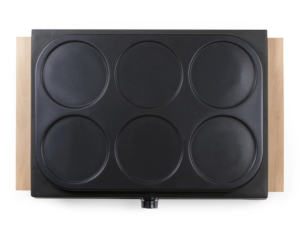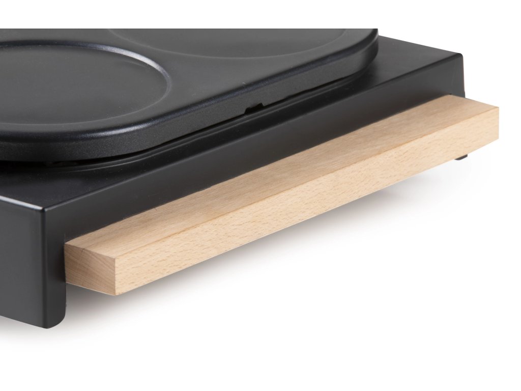 Tento vysokokvalitný spotrebič je vybavený keramickým nepriľnavým povrchom bez obsahu PFAS. Ani dizajn nebol ponechaný náhode. Drevené rukoväte mu dodávajú štýlový vzhľad. Jednoduchosť je prednosťou - na zapnutie alebo vypnutie prístroja stačí otočiť gombíkom teploty.
