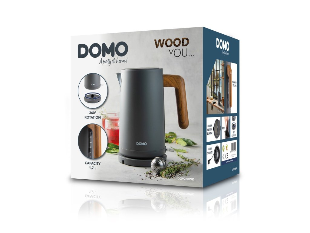 Nový komplexný rad WOOD YOU sú veľmi moderné spotrebiče s kovovým/plechovým telom nastriekaným matnou sivou farbou a príslušenstvom v drevenom dekore. Drevo a tmavosivá farba pôsobia veľmi luxusne s nádychom rustikálneho šarmu, preto neváhajte a pozrite si aj ostatné spotrebiče DOMO - WOOD YOU.Rýchlovarná kanvica sa v každej domácnosti používa niekoľkokrát denne, preto sa uistite, že ste si vybrali tú správnu s vysokým bezpečnostným štandardom. Vďaka 360-stupňovej otočnej základni sa ľahko používa, a to pre pravákov aj ľavákov. Patentovaný bezpečnostný systém Otter sa vždy včas vypne, keď kanvica dosiahne bod varu, keď ju odoberiete zo základne, alebo dokonca keď beží naprázdno bez vody.
