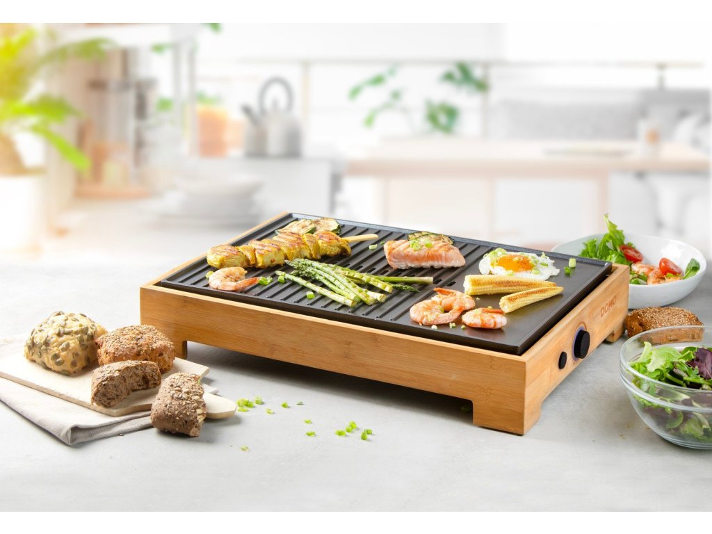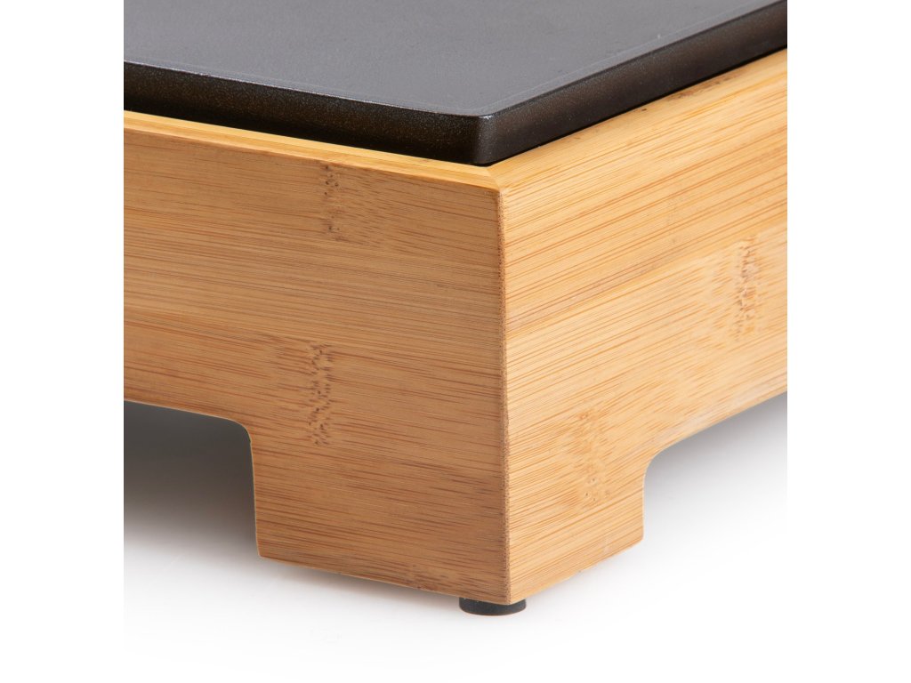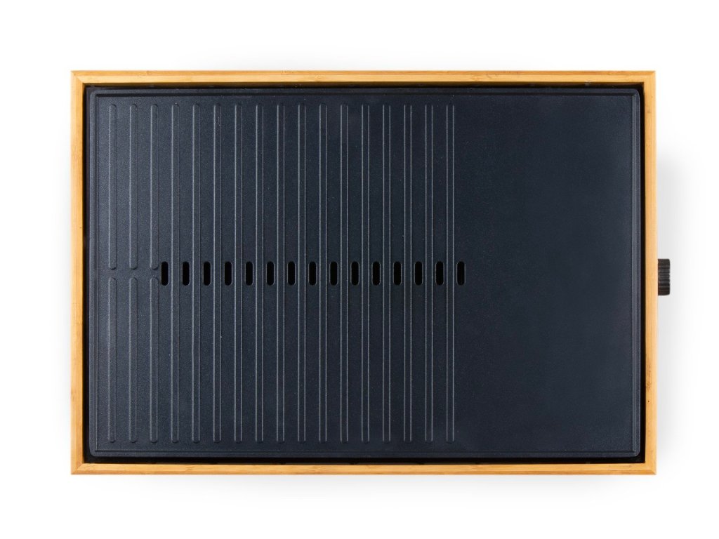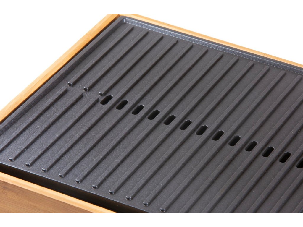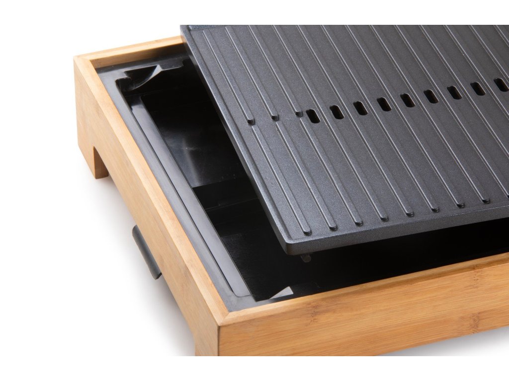 Grilovacia plocha s rozmermi 42 x 28 cm je vhodná na intímne večere a/alebo večery s priateľmi či rodinou. Termostat a príkon 1 800 W zaručujú zahriatie na ideálnu teplotu v krátkom čase!Vychutnajte si grilované pokrmy s týmto štýlovým grilom PLANCHA v prémiovom dizajne z pravého bambusu a nepriľnavým povrchom bez PFOS.