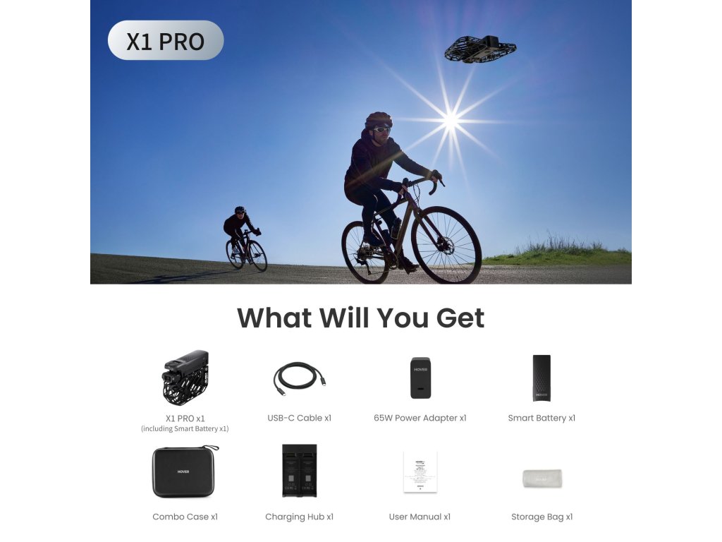 Obsah balenia: HOVERAir X1 Pro (s bateriou), kábel USB-C, náhradná batéria, rozbočovač na nabíjanie batérie, 65W napájací adaptér a puzdroCombo, používateľská príručka.