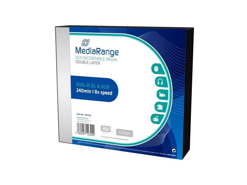 Kvalitné a cenovo dostupné dvojvrstvové médiá DVD+R značky MediaRange. Poskytujú spoľahlivý zápis dát s kapacitou až 8,5 GB pri maximálnej rýchlosti zápisu až 8x. Je to teda ideálne riešenie zálohovania veľkého množstva dát, (napr. digitálne video, fotografie, zvukové záznamy či ďalšie súbory.) Médiá sú balené po 5 kusoch v slimcase. Kapacita: 8,5 GB Typ média: DVD+R dvojvrstvové Max. zapisovacia rýchlosť: 8x Balenie: slimcase 5ksDodatočné parametre