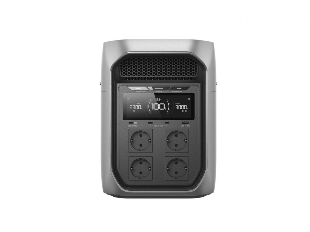 Přenosná bateriová stanice EcoFlow DELTA 3 Max Plus nabízí jmenovitý výkon 3 000 W a špičkový výkon až 6 000 W. S využitím originální funkce X-Boost je navíc připravena napájet některé typy spotřebičů s příkonem až do 3 900 W. Její kapacitu 2 048 Wh, lze rozšířit přídavnými bateriemi až na 12 kWh. Umožňuje tedy dodávat déledobě energii domácím spotřebičům i energeticky náročnějším pracovním nástrojům. Hodí se rovněž jako záložní zdroj (UPS) pro případy výpadků elektrické sítě, a to s rychlostí přepnutí 10 ms. EcoFlow DELTA 3 Max Plus je bateriová stanice s akumulátorem LiFePO4, základní kapacitou 2 048 Wh, která je rozšiřitelná přídavnými bateriemi až na 12 kWh. Má několik výstupů, včetně zásuvek střídavého proudu nebo portů USB-A a USB-C a je tedy připravena napájet domácí spotřebiče i energeticky náročnější pracovní nástroje. Různé možnosti nabíjení umožňují využívat jednotlivé způsoby podle aktuálních potřeb. Stanice tedy představuje nejen velmi spolehlivý, ale zároveň i velmi flexibilní zdroj energie. Disponuje rovněž velmi prostorným displejem, který přehledně zobrazuje informace o aktuálních parametrech jejího provozu. Mnoho způsobů nabíjení Stanice se nabíjí prostřednictvím síťové zásuvky, solárních panelů, autozásuvky nebo generátoru. Je možné ji připojit i k systému PowerStream s komplexnějším využitím solární energie, které přináší mj. i snížení celkových nákladů. Široké možnosti napájení spotřebičů DELTA 3 Max Plus může napájet běžné domácí spotřebiče, včetně chladniček, televizorů a počítačů. Zároveň však v přírodě nebo na jiných odlehlých místech bez problémů pohání zařízení používané při rekreaci i energeticky náročnější pracovní nástroje. X-Boost: napájení přístrojů s vyšším příkonem X-Boost je inovativní technologie, která je exkluzivní pro bateriové stanice EcoFlow a této stanici umožňuje napájet některé spotřebiče s příkonem až do 3 900 W. Zdroj nepřerušovaného napájení (UPS) DELTA 3 Max Plus může sloužit rovněž jako záložní zdroj pro nepřetržité napájení důležitých spotřebičů při výpadcích elektrické sítě, a to s dobou přepnutí 10 ms. Rozšiřitelná kapacita Stanice je připravena k navýšení své kapacity až na 12 kWh, a to prostřednictvím připojení přídavných baterií DELTA 3 Max Extra Battery, DELTA 3 Extra Battery, DELTA Pro 3 Extra Battery nebo DELTA 2 Extra Battery. Vzdálené ovládání chytrou aplikací Prostřednictvím chytré mobilní aplikace EcoFlow lze provoz stanice sledovat a ovládat z jakéhokoliv místa s přístupem k internetu. Technické specifikace Obecné Model: EF-DL3-MP Čistá hmotnost: cca 22,1 kg Rozměry (Š x H x V): cca 494 × 242 × 305 mm Wi-Fi (2,4 G): podporováno Bluetooth: podporováno Provozní nadmořská výška: < 3 000 m n. m. Kategorie přepětí: II Stupeň znečištění: 2 Krytí IP: IP20 UPS: 10 ms Výstup AC výstup (pouze vybíjení): 230 V ~ 50 Hz, celkem 3 000 W (surge 6 000 W), max. 13 A (4x) na port AC výstup (režim Bypass): 220–240 V ~ 50/60 Hz, celkem 3 000 W, max. 13 A (4x) na port USB-A (1x): 5 V ? 3 A / 9 V ? 2 A / 12 V ? 1,5 A, max. 18 W USB-C (1x): 5 V ? 3 A / 9 V ? 3 A / 12 V ? 3 A / 15 V ? 3 A / 20 V ? 5 A / 28 V ? 5 A, max. 140 W USB-C (2x): 5 V ? 3 A / 9 V ? 3 A / 12 V ? 3 A / 15 V ? 3 A / 20 V ? 2,25 A, max. 45 W na port, celkem 45 W. 12V DC port: 12,6 V ? 30 A, celkem 378 W (Anderson port max. 30 A, zapalovač cigaret max. 10 A) Vstup AC vstup (pouze nabíjení): 220–240 V ~ 10 A, 50/60 Hz AC vstup (režim Bypass): 220–240 V ~ 10 A, 50/60 Hz DC vstup: 12 V ? max. 8 A, 24 V ? max. 8 A, 48 V ? max. 10,4 A Solární vstup: 11-60 V ? max. 18 A Baterie Jmenovitá kapacita: 2048 Wh (51,2 V ? 40 Ah) Typ článků: LFP (LiFePO4) Typ ochrany: ochrana proti přepětí, ochrana proti přetížení, ochrana proti přehřátí, ochrana proti zkratu, ochrana proti nízké teplotě, ochrana proti nízkému napětí, ochrana proti nadproudu. Port přídavné baterie (vstup): 43,2-57,6 V ? max 93 A Port přídavné baterie (výstup): 43,2-57,6 V ? max. 46 A Teplota prostředí Optimální provozní teplota: 20 °C až 30 °C Teplota při nabíjení: 0 °C až 45 °C Teplota při vybíjení: –10 °C až 45 °C Skladovací teplota: –10 °C až 45 °C (optimálně 20 °C až 30 °C) Obsah balení 1. Přenosná bateriová stanice EcoFlow DELTA 3 Max Plus - 1 ks 2. Nabíjecí AC kabel - 1 ks 3. Návody a záruční listDodatočné parametre