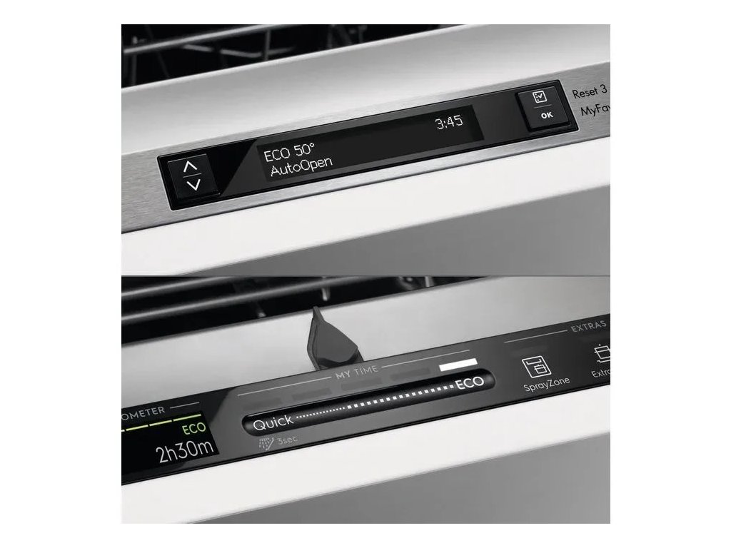 Kľúčové vlastnosti Electrolux 600 FLEX QuickSelect EEQ47210L Technológia AirDry s automatickým otvorením dverí a prirodzeným sušením Rýchle nastavenie funkcie QuickSelect Svetelná indikácia TimeBeam Inteligentný program AutoSense Jednoduchá inštalácia Posuvné závesy PerfectFit Programy 160 minút 60 minút MachineCare program na čistenie vnútra spotrebiča Quick 30 minút Opláchnutie a čakanie Kompletné vysvetlenie programov nájdete v návode. Vlastnosti Funkcia QuickSelect pre rýchle nastavenie programu Svetelná indikácia TimeBeam informuje o stave umývacieho programu Systém sušenia AirDry využíva prirodzené prúdenie vzduchu Posuvné závesy PerfectFit sa prispôsobia akémukoľvek rozmeru Panel s textom a symbolmi Možnosť odloženého štartu 1 – 24 hodín Indikátor doplnenia soli XtraPower – extra silný 2 nastaviteľné nôžky Funkcia Auto Off šetrí energiu a automaticky sa spustí po dokončení programu Obrazové materiály sú ilustračné a umývačka sa dodáva bez dekoru na dverách Vnútorná výbava Výškovo nastaviteľný horný kôš, dokonca aj pri plnom naložení Horný kôš má skladacie poličky na šálky Dolný košík má 2 rozložiteľné tanierové poličky Technické parametre energie 0,921 kWh/cyklus Spotreba vody 9,9 l/cyklus Hlučnosť 44 dB Výška 81,8 – 87,8 cm Šírka 59,6 cm Hĺbka 55 cm Výška pre zabudovanie 82 – 88 cm Šírka pre zabudovanie 60 cm Hĺbka pre zabudovanie výrobcu, nie sú do nich započítané presahy jednotlivých častí spotrebiča (napr. ovládací panel, dvierka, apod.).Dodatočné parametre