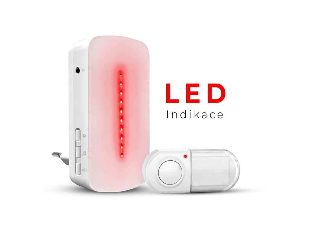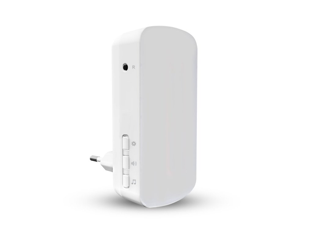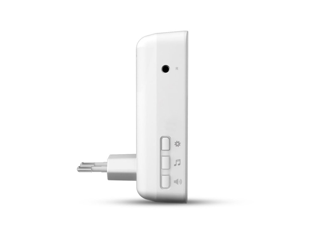 Sada obsahuje zvonček (prijímač) pre sieť 230 VAC a tlačidlo (vysielač) na 3 V batériuModerný dizajn prijímača nezaberá zbytočne miesto v zásuvke pre iný spotrebič