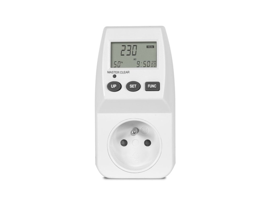 Zobrazuje aktuálny čas, sieťové napätie a frekvenciu, prúd a spotrebu energie spotrebiča, účinník.