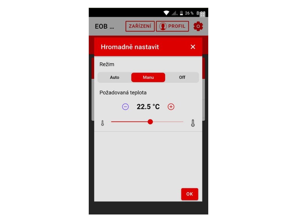 Vlastnosti termostatu PT14-P WiFi WiFi: Je vhodný pre domácnosti, rodinné domy, kancelárie s elektrickým vykurovaním. Môže spínať jednosmerné topné telesá, elektrické sálavé panely alebo elektrické podlahové vykurovanie do 16 A. Všetky parametre možno nastaviť pomocou webovej aplikácie: https://eobwifi.elektrobock.cz. alebo z aplikácie EOB WiFi pre mobilné telefóny: Aplikácie pre android iOS Aplikácie pre iOS Zásady ochrany osobných údajov Výhody PT14-P WiFi: Veľký podsvietený displej Nastaviteľná hysteréza od 0,1 ° C do 6 ° C Týždenné nastavenie programu so 6 zmenami za deň (3 teploty, úsporný zapnutie letný režim režim "OKNO" výber minimálneho času zapnutia korekcia aktuálnej teploty možnosť uzamknutia kľúčom automatická zmena zimného/letného času teplota proti zamrznutiu 3 °C nastavený program pokračuje aj v prípade výpadku WiFi pripojenia aplikácie pre systémy iOS, Android a Windows 10 na bezplatné stiahnutie v slovenčine (výber jazykov EN (230 V/ 50 Hz) Typ termostatu s modulom WiFi (2,4 GHz) Typ regulácie s hysterézou (0,1 °C až 6 °C) Presnosť 1 °C Rozmery (DxŠxV) 81x81x27 mm Stupeň krytia IP20 Prevádzková teplota 0 °C až 4 za deň 6 Nastaviteľný teplotný rozsah 3 °C až 39 °C Nastavenie teploty v krokoch po 0, 5 °C Min. čas programovania 10 min. Min. skok indikácia 0, 5 °C Žiadne pripojenie externého snímača Trieda ochrany II Zálohovanie batériou Nie Zálohovanie paměti AnoDodatočné parametre