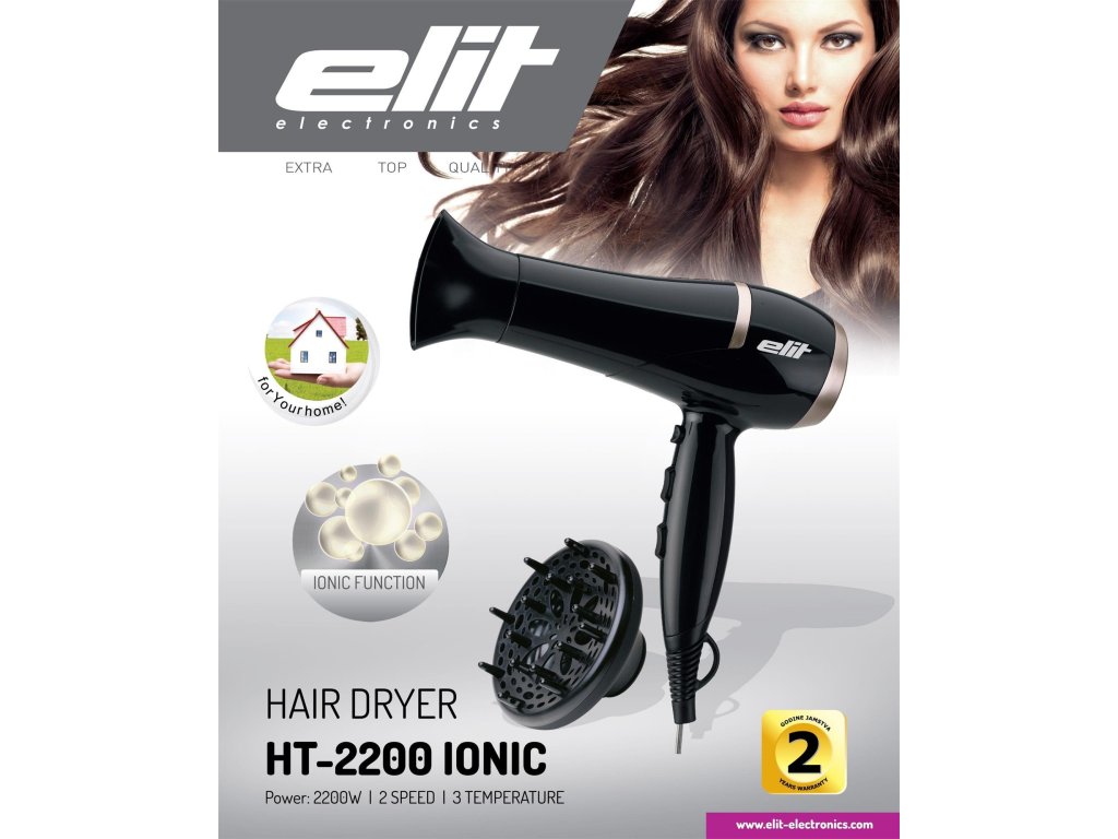 ELIT HT-2200 IONIC - pre dokonale upravené vlasy Predstavujeme vám nový fén ELIT HT-2200 IONIC, ktorý posúva starostlivosť o vaše vlasy na úplne novú úroveň. Tento výkonný a štýlový fén kombinuje najnovšie technológie s elegantným designom, aby vám poskytol profesionálne výsledky priamo u vás doma. Vďaka výkonnému motoru dosiahnete rýchle a účinné sušenie vlasov bez ich poškodenia. Kľúčové vlastnosti: Kľúčové funkcie, ktoré vám pomôžu s úpravou vlasov: Iónová funkcia: záporne nabité ióny znižujú statickú elektřinu, uzatvárajú vlasové kutikuly a vaše vlasy sú lesklé a hebké. Nastavenie teploty a rýchlosti: Vyberte si z 3 nastavení teploty a 2 nastavenia rýchlosti, ktoré zodpovedajú vášmu typu vlasov a požadovanému štýlu. Funkcia studeného vzduchu. Zabudovaná ochrana proti prehriatiu zaisťuje bezpečnosť počas používania. Praktické príslušenstvo. Ergonomický dizajn. Špecifikácia : Príkon 2200 W. Napätie: 220-240 V Frekvencia: 50/60 Hz 3 nastavenie teploty 2 rýchlosti Iónová funkcia Funkcia studeného vzduchu Difuzér Ochrana proti prehriatiuDodatočné parametre