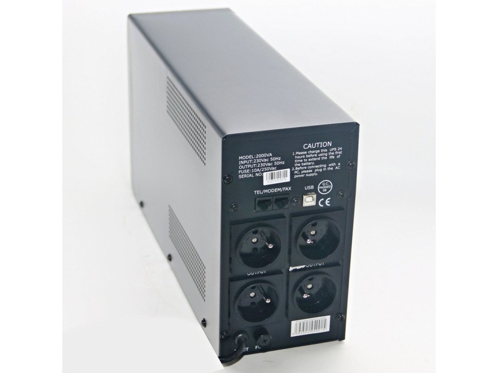 UPS EA200LED typu Line Interactive. Na čelnom paneli vypínač ON/OFF a 3 LED indikujúce druh prevádzky Špecifikácia Kapacita/výkon: 2000VA / 1200W Vstupné napájanie: 230V AC, 50Hz Výstup: 230VAC +/-10% Oneskorenie prepnutia: 2-6ms 12V/9Ah, 2ks Čas nabíjania: 8 hodín Čas zálohovania pri zaťažení 100W: 30min Rozmery: 380x125x220mm (hĺbka x šírka x výška) Hmotnosť: 14kg Pracovné prostredie: 0-40°C, 0-90% RH Pripojenie výstupy 2x (pripojeného zariadenia proti prepätiu) Obsah balenia: USB kábel, CD, užívateľská príručkaDodatočné parametre