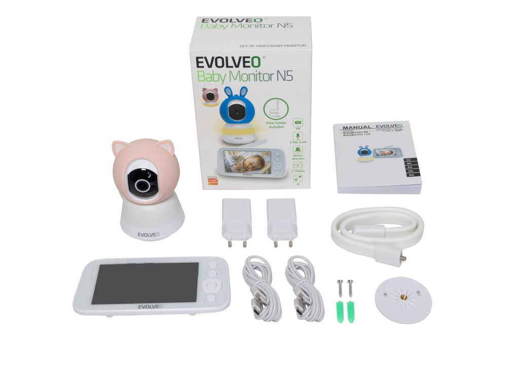 EVOLVEO Baby Monitor N5 - Súprava video monitora s 360° monitorovaním, obojsmernou komunikáciou a uspávankami,