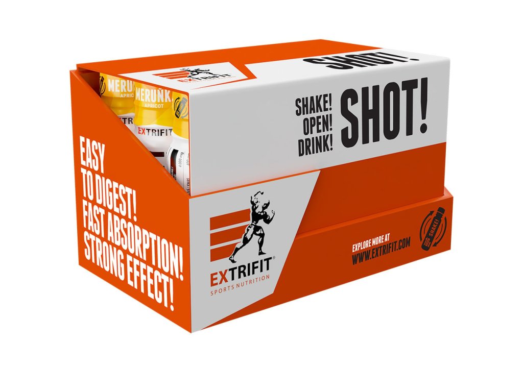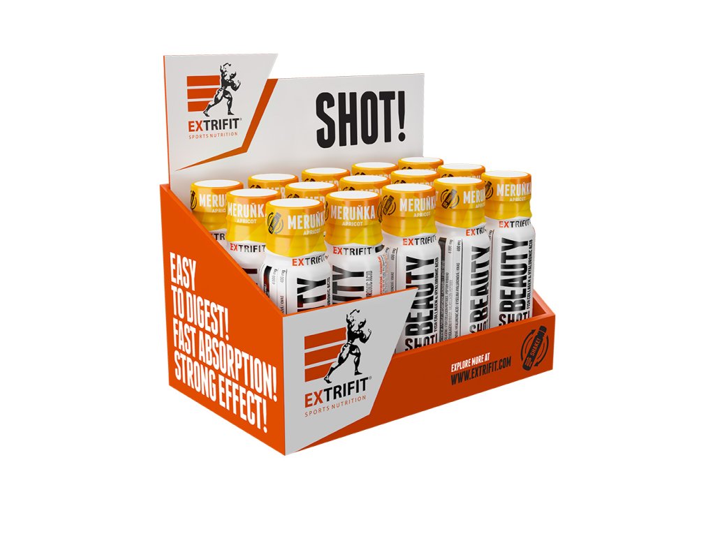 Péče o vzhled bývá náročná. S doplňkem BEAUTY SHOT! je to otázka pár vteřin. Prémiové kolagenní peptidy VERISOL® z mořských ryb a 400 mg kyseliny hyaluronové. Kombinace, kterou oceňují lidé pečující o vizáž do detailu – od každodenní skincare rutiny až po soutěžní formu. Mimořádně účinné duo: značkové kolagenní peptidy VERISOL® s vysokou biologickou dostupností a kyselina hyaluronová. Minimalistické složení, lahodná chuť a pohodlné dávkování. Hodí se ráno, po tréninku i večer – přesně podle tvého režimu. Díky tekuté formě tělo aktivní látky vstřebá rychle a efektivně. Proč si BEAUTY SHOT! vybereš i ty: 4 000 mg kolagenních peptidů VERISOL® – klinicky ověřená dávka pro maximální účinek. 400 mg kyseliny hyaluronové – až 4× větší množství v porovnání s běžnými produkty! Vezmeš kamkoli – do kapsy, kabelky nebo sportovní tašky. ?? Hotovo za pár vteřin – žádná příprava, žádné míchání. Protřep, otevři, vypij. Jak ho zařadit? 1× denně kdykoli. Hodí se ráno, do práce, po tréninku i večer. Pro jemnější chuť nařeď do 50 ml vody. Pro koho Ideální pro ženy i muže. Od běžného dne v kanceláři až po soutěžní scénu. Zkrátka pro každého, kdo chce péči o vzhled řešit rychle, snadno a chutně. Shoty EXTRIFIT® – česká výroba Naše shoty vyrábíme pod jednou střechou v Dolním Újezdě: vlastní vývoj, vlastní technologie, naše odpovědnost za každý mililitr. Celý proces držíme pevně v rukou – od výběru těch nejlepších surovin, přes testování a míchání, až po balení a expedici. Každou šarži si hlídáme sami. Žádné anonymní fabriky, žádný outsourcing. Jen precizní výroba a výsledek, na který se můžeš spolehnout. Doporučené dávkování: Denní dávka = 1 lahvička (90 ml). Užívejte kdykoliv během dne. Ředění do 50 ml vody Po otevření neskladujte Tabulka nutričních hodnot: Obsah účinných látek: 1 lahvička (90 ml) Peptidy rybího kolagenu 4000 mg Kyselina hyaluronová 400 mg Složení: voda, peptidy rybího kolagenu, regulátor kyselosti: kyselina citrónová, aroma, hyaluronát sodný, konzervanty: sorban draselný a benzoan sodný, sladidlo: sukralóza. Balení: 90 ml / 15 x 90 ml Upozornění: Uchovávejte mimo dosah dětí. Nevhodné pro děti, těhotné a kojící ženy. Nepřekračujte denní doporučenou dávku. Není náhradou pestré stravy. Minimální trvanlivost do: viz. obal.Dodatočné parametre