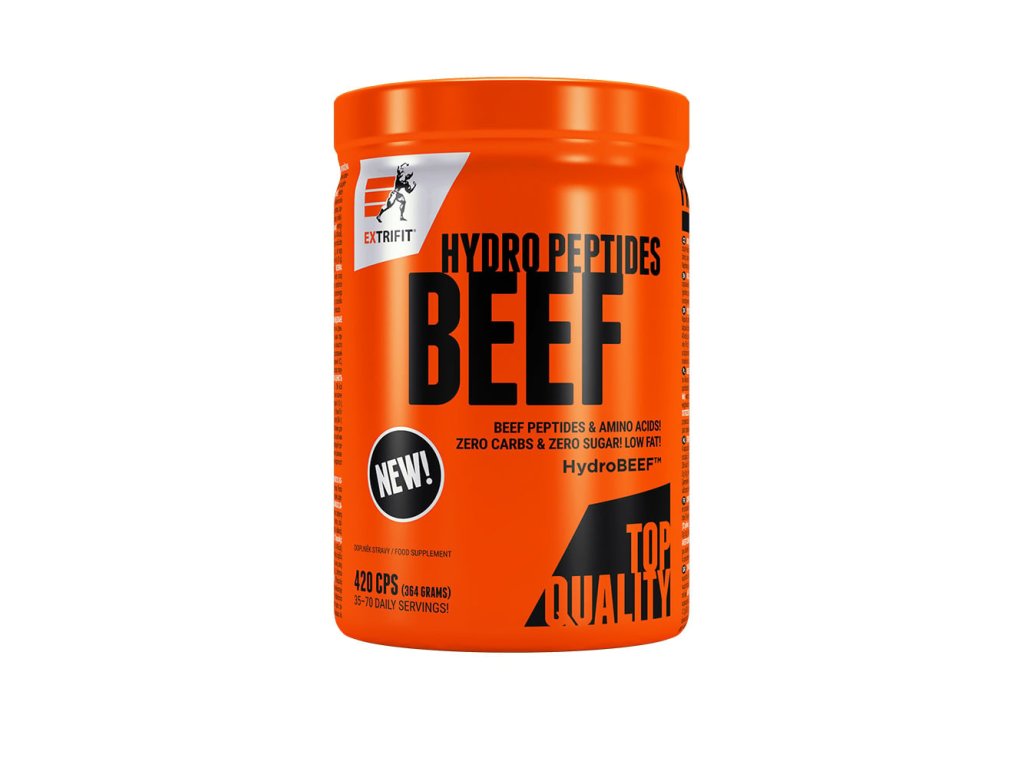 BEEF HYDRO PEPTIDES obsahuje bílkoviny v peptidických vazbách pro rychlou dostupnost aminokyselin. Jejich zdrojem je HydroBEEF™ – evropský hovězí izolát navržený speciálně pro sportovní výživu. Proč HydroBEEF™? HydroBEEF™ = vysoký obsah bílkovin, špičková kvalita a maximální čistota. Díky značkové surovině HydroBEEF™ se Extrifit® jasně odlišuje od mnoha „beef“ suplementů, které nedeklarují jasný původ suroviny. HydroBEEF™ navíc obsahuje minimum tuků, žádné cukry ani laktózu! Tyto jedinečné nutriční vlastnosti odpovídají požadavkům nejpřísnějších diet. BEEF HYDRO PEPTIDES nově v kapslích! Rychlá vstřebatelnost: Želatinové kapsle neobsahují žádná pojiva ani zbytečná aditiva. Účinné „beef“ peptidy se tak dostávají do krevního oběhu co nejrychleji. Pohodlí: Bez šejkru, bez prášku, bez mytí lahví. Vezmeš kapsle, zapiješ vodou a máš hotovo – v šatně, na cestách i v náročných podmínkách, kde by mixování proteinu spíše překáželo. Originalita: Kapsle nesou logo Extrifit® a potisk je z přírodního barviva. Při vývoji suplementů klademe důraz na každý detail. V čem je BEEF HYDRO PEPTIDES unikátní: HydroBEEF™ – prémiová evropská surovina pro sportovní výživu Bez cukrů, nízký obsah tuku, bez laktózy – diet-friendly volba Až 8 000 mg peptidů a aminokyselin v denní dávce Kapslová forma bez přídatných látek – čisté složení, přesné dávkování Rychlá stravitelnost a vstřebatelnost Maximálně naplněné balení až po okraj Kdy a jak použít: Před tréninkem: doplň hovězí peptidy bez laktózy, než na to vlítneš. Po tréninku: s gainerem/proteinem pro podporu regenerace. V dietě a k jídlům chudým na protein: čistý zdroj aminokyselin bez cukrů. BEEF HYDRO PEPTIDES – to je čistá hovězí síla v každé kapsli Doporučené dávkování: užívejte 6-12 kapslí denně denní dávku můžete rozdělit na několik porcí kapsle zapijte dostatečným množstvím tekutin Tabulka nutričních hodnot: 100 g 12 cps Energetická hodnota 1621 kJ/386 kcal 169 kJ/40 kcal Tuky 0,8 g 0,1 g - z toho nasycené mastné kyseliny 0,7 g 0,1 g Sacharidy 0 g 0 g - z toho cukry 0 g 0 g Vláknina 0 g 0 g Bílkoviny 95 g 10 g Sůl 1,20 g 0,13 g Typický profil aminokyselin: 100 g 12 cps L-alanin 6 878 mg 716 mg L-arginin 5 862 mg 610 mg L-cystein 78 mg 8 mg Glycin 15 632 mg 1 626 mg L-histidin 860 mg 89 mg Kyselina asparagová 4 690 mg 488 mg Kyselina glutamová 8 597 mg 894 mg L-lysin 2 970 mg 309 mg L-methionin 703 mg 73 mg L-fenylalanin 1 797 mg 187 mg L-prolin 9 379 mg 976 mg L-hydroxyprolin 7 972 mg 829 mg L-serin 2 657 mg 276 mg L-threonin 1 641 mg 171 mg L-tryptofan 282 mg 29 mg L-tyrosin 1 016 mg 106 mg L-leucin 2 892 mg 301 mg L-izoleucin 1 329 mg 138 mg L-valin 2 344 mg 244 mg CELKEM AMINOKYSELIN 77 579 mg 8 071 mg Složení: HydroBEEF® - hovězí hydrolyzovaný proteinový izolát (země původu: EU), kapsle (želatina, barvivo: oxidy železa, leštící látka: šelak) Upozornění: Uchovávejte mimo dosah dětí. Nevhodné pro děti, těhotné a kojící ženy. Nepřekračujte denní doporučenou dávku. Není náhradou pestré stravy. Minimální trvanlivost viz obal.Dodatočné parametre