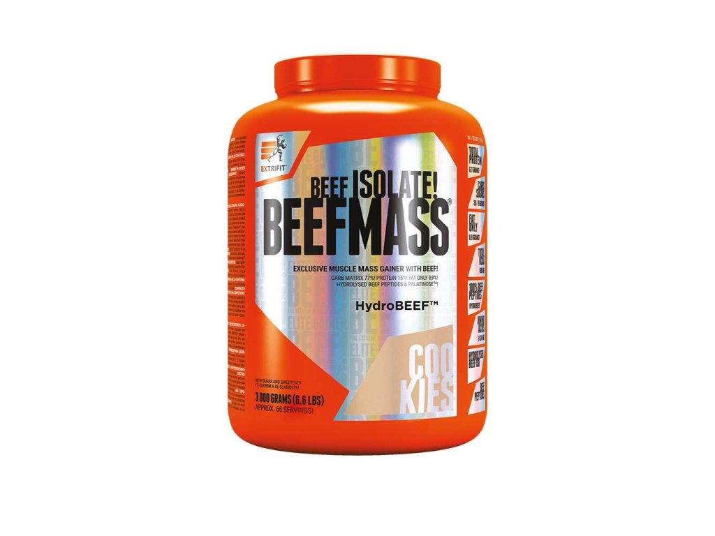 Upozornenie: Etikety tohto výrobku sa postupne aktualizujú. Preto sa 3000 g balenie v novom celooranžovom dizajne môže v niektorých detailoch mierne líšiť od 1500 g a 45 g balenia v pôvodnom dizajne so strieborným reliéfom. Rozdiely súvisia s legislatívnym spresnením niektorých údajov a nahradením guarovej a xantánovej gumy celulózou ako zahusťovadlom. Tieto zmeny nemajú vplyv na chuťový profil ani na účinky výrobku.Sacharidovú zložku BeefMass tvorí trojkombinácia sacharidov s postupným uvoľňovaním jednotiek glukózy: stredne rýchly maltodextrín, rýchla dextróza a pomalá palatinóza (izomaltulóza), sacharid s nízkym glykemickým indexom. Použitie gainerového proteínu BeefMass v príchuti Extrifit je podporené prírodnými enzýmami bromelaín a papaín v príchuti čokoláda a 7 enzýmami v ostatných príchutiach. Všetky príchute majú vynikajúcu chuť.