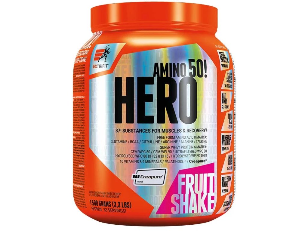 Unikátne složenie - v produkte Hero nájdete 37 účinných látok! Exkluzívne a špičkové zdroje zložiek! Hero sa používa po tréningu na podporu svalového rastu a regeneracie. Hero obsahuje nasledujúce komplexy (matrixy): Whey Protein 6 Matrix (WPC + CFM + HYDRO (3:2:1)) - na rast a udržanie aktívnej svalovej hmoty: - syrovátkový proteínový koncentrát vyrobený metódou ultrafiltrácie - enzymaticky hydrolyzovaný 80% syrovátkový proteinový hydrolyzovaný syrovátkový 80% proteinový koncentrát so stupňom hydrolýzy DH 32 enzymaticky hydrolyzovaný syrovátkový 90% proteinový izolát so stupňom hydrolýzy DH 8 - CFM syrovátkový 80% proteinový koncentrát vyrobený mikrofiltráciou - CFM syrovátka 90 Matrix s postupným uvoľňovaním jednotiek glukózy (1:1:1:1) - na dodávanie energie: - Izomaltulóza (palatinóza) - kukuričný škrob - maltodextrín - dextróza Amino Acid 21 Matrix - pre antikatabolický účinok a regeneraciu svalov Free Form Amino 11000 mg/100g: - L-alanín vo volnej forme - L-glutamín volná forma - L-citrulín DL-malát volná forma - L-arginín AKG volná forma - taurín voľná forma 2000 mg/100 g - BCAA 2:1:1 vo volnej forme a peptidovej0 väzbe 5290 mg/100 g (voľný 1111 mg/100 g) - L-izoleucín 3004 mg/100 g (voľný 556 g/100 g) - L-Valín 2943 mg/100 g (voľný 556 mg/100 g) Energy and Strength značkový nemecký kreatín monohydrát - 2000 mg/100 g - inozín - energizér pre svalovú prácu - taurín vo volnej forme - stimulant, odďaľovač únavy Mineral 7 Matrix - na okamžité doplnenie základných minerálov v ideálnych formách pre správnu funkciu orgánov a regeneráciu svalov po cvičení: Prírodný - Prírodný 180 mg/100 g (48 % RHP) - prispieva k normálnemu energetickému metabolizmu, normálnej syntéze bielkovín, normálnej činnosti svalov a nervového systému, rovnováhe elektrolytov a zníženiu miery únavy a vyčerpania, prispieva k normálnej psychickej činnosti - draslík - 797 mg/100 g systému a na udržanie normálneho krevního tlaku - vápnik - 401 mg/100 g (50 % RHP) - prispieva k normálnemu energetickému metabolizmu, normálnej činnosti svalov, normálnemu prenosu nervových vzruchov a normálnej zrážanlivosti krvi a je potrebný na udržanie normálneho stavu kostí a zubov - fosfor - 2 k normálnemu energetickému metabolizmu, normálnej funkcii bunkových membrán a normálnemu stavu kostí a zubov - Sodík - 511 mg/100 g - jeden z najdôležitejších elektrolytov v ľudskom tele - Zinok - 6,7 mg/100 g (67 % RHP) - prispieva k normálnemu metabolizmu kyselin, normálnej syntéze DNA a bielkovín, normálnej funkcii imunitného systému a ochrane buniek pred oxidačným stresom, udržanie normálnej hladiny testosterónu a normálnej plodnosti a reprodukcii - Chróm - 220 mcg/100 g udržanie normálnej hladiny glukózy v krvi - Vitamín 10 Matrix - na doplnenie vitamínov presne podľa odporúčaného denního RHP: Obsah pridaných vitamínov: - Vitamín B1 - 1,2 mg/100 g (111 % RHP) - prispieva k normálnemu energetickému metabolizmu, normálnej činnosti nervového 1,6 mg/100 g (111 % RHP) - prispieva k normálnemu energetickému metabolizmu, normálnej funkcii nervového systému, k zníženiu únavy a vyčerpania ak ochrane buniek pred oxidačným stresom - Vitamín B3 - 17,8 mg/100 g (111 % RHP) zníženie únavy a vyčerpania a normálnej duševnej činnosti - Vitamín B5 - 6,7 mg/100 g (111 % RHP) - prispieva k normálnemu energetickému metabolizmu, normálnej syntéze metabolizmu steroidných hormónov, vitamínu D a niektorých neurotransmiterov, prispieva k zníženiu únavy mg/100 g (111 % RHPI) - prispieva k normálnemu energetickému metabolizmu, normálnemu metabolizmu bielkovín a glykogénu, normálnej činnosti nervového systému, regulácii hormonálnej činnosti, normálnej činnosti imunitného systému, k zníženiu únavy a vyčerpania ak normálnej duševnej činnosti - Biotín - 0,06 mg/10 energetickému metabolizmu, normálnej činnosti nervového systému, normálnemu metabolizmu makroživín a normálnej psychickej činnosti - kyselina listová - 0,22 mg/100 g (111 % RHP) - prispieva k normálnej syntéze aminokyselín, normálnej tvorbe krvi, normálnej funkcii imunitného systému, normálnej činnosti a normálnej činnosti. 0,00278 mg/100 g (111 % RHP) - prispieva k normálnemu energetickému metabolizmu, normálnej funkcii nervového systému, normálnej duševnej činnosti, normálnej funkcii imunitného systému ak zníženiu únavy a vyčerpania - Vitamín C - 89 mg/100 g (111 % RHP) - prispieva k udržaniu normálnej funkcie imunitného systému počas intenzívneho fyzického výkonu a po ňom, k normálnej tvorbe kolagénu pre normálnu funkciu energetickému metabolizmu, normálnej funkcii nervového systému, normálnej psychickej funkcii, normálnej funkcii imunitného systému, ochrane buniek pred oxidačným stresom ak zníženiu únavy a vyčerpania - vitamín E - 13 mg/100 g (111 % RHP) - prispieva k ochrane buniek svalovej hmoty a na jej udržanie v situáciách, keď hrozí ho katabolizácia, napr. pri veľmi intenzívnom alebo dlhodobom tréningu. Hero je skvelá investícia! 37 všetkých účinných látok potrebných na potréningové doplnenie energie, ktoré nenabíka žiadny iný produkt! Nie je potrebné kupovať jednotlivé potréningové doplnky každý zvlášť! Extrifit ponúka Hero vo viacerých lahodných príchutiach. Hotový nápoj má krémovú konzistenciu a skvelú chuť. Je to doplnok stravy. Dávkovanie: - záleží na telesnej hmotnosti, športovej aktivite a zložení stravy - odporúčame rozdeliť dennú dávku (max. 2 odmerky/balenie) na 2 porcie, ktoré by sa mali konzumovať ako desať medzi jedlami a najmä v tréningovom dni do 30 minút po tréningu - obsah jednej odmerky/vrecúška2 mliekaDodatočné parametre