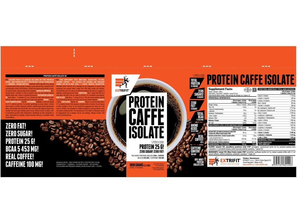 Ako bielkovinovú zložku v Protein Caffé Isolate 90 si Extrifit vybral mimoriadne kvalitný 90% CFM srvátkový izolát s veľmi vysokým obsahom BCAA a vynikajúcou stráviteľnosťou. Osobitná pozornosť bola venovaná výberu kvalitnej instantnej kávy s 2 % prírodného kofeínu a lahodnou chuťou. Káva je v Protein Caffé Isolate 90 zastúpená vo veľmi vysokom množstve 10 %.