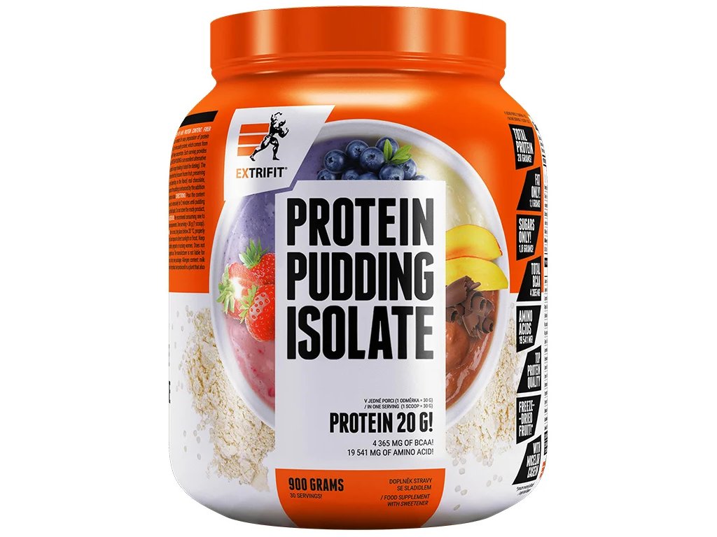 Proteínový pudingový izolát - lahodný fitness puding bez nutnosti varenia! Milujete puding, ale nemáte čas na varenie a hromadenie riadu? Proteín Pudding Isolate si pripravíte za dve minúty ľan z vody alebo mlieka! Ideálna volba na zdravé proteínové občerstvenie doma, v kancelárii aj na cestách. Každá porcia obsahuje 20 g kvalitných bielkovín z 90 % syrovátkového izolátu CFM, 85 % micelárneho kaseínového izolátu a 80 % syrovátkového koncentrátu. Tento jedinečný proteínový komplex podporí regeneráciu a rast svalov po náročnom tréningu. Súčasťou sú aj chutné proteínové kŕmky bez pridaného cukru, zložené ľan z rýže a syrovátkového izolátu - pre ešte lepší zážitok z každej porcie! Prémiové zložky, prémiové ingrediencie V spoločnosti Extrifit sa zameriavame na prémiovú kvalitu, takže sa môžete tešiť na prémiové zložky, ktoré v bežných výrobkoch nenajdete. A rozhodne sme nešetrili na množstve! Ovocné príchute: Doprajte si pravú chuť ovocia s lyofilizovaným ovocím, ktoré si zachováva svoju prirodzenú chuť, farbu a všetky vitamíny. Veľké balenie (900 g) obsahuje až 540 g čerstvého ovocia! Čokoládová príchuť. Kokosová príchuť: Používame jemne strúhaný kokos v jeho najčistejšej možnej forme, bez konzervačných látok. Vanilková príchuť: S pravými vanilkovými semienkami pre autentickú chuť. Každá porcia prináša navyše 4365 mg BCAA a 19541 mg aminokyselín! 19,5 milióna aminokyselín pre dlhší pocit sýtosti ako pri koktejle Proteín Puding Isolate je skvelou alternatívou ku klasickým proteínovým koktejlom – zasýti vás na dlhšie, a pritom je rovnako jednoduchý na prípravu. Jeho krémová konzistencia vám poskytne dlhší pocit sýtosti, čo oceníte najmä pri diéte, keď máte chuť na niečo vydatné a chutné. Bielkovinové desiate na cesty aj do kancelárie Proteínový pudingový izolát je k dispozícii v dvoch variantoch, ktoré vyhovujú moderným potrebám. Vyberte si medzi ekonomickým balením (900 g) na doma alebo do práce a jednorazovými vrecúškami (30 g), ktoré sú ideálne na cesty alebo do posilňovne. Stačí zmiešať a vychutnať si lahodnú proteínovú svačinu kedykoľvek a kdekoľvek! Ide o doplnok stravy. Dávkovanie: Vlejte obsah jednej odmerky do 150 ml vody alebo odstredeného mlieka, intenzívne míchajte 2 minúty, kým nevznikne pudingová hmota. pre lepší chuťový zážitok používajte chladené tekutiny hotový výrobok neskladujte, je určený na okamžitú spotrebu odporúčame konzumovať jednu až dve porcie denne v závislosti od vašej dennej potreby bielkovín jedna porcia = 30 g (1 odmerka) Výživové údaje: 1 odmerka (30 g) 100 g Kokosové Ostatné Kokosové Ostatné 4 kJ / 106 kcal 1 612 kJ / 384 kcal 1 478 kJ / 352 kcal Tuk 1,9 g 1,1 g 6,2 g 3,6 g - Nasýtené mastné kyseliny 1,5 g 0,6 g 5,0 g 2,0 g Sacharidy 3 0,9 g 1,7 g 2,9 g 5,7 g Vláknina 2,0 g 1,7 g 6,6 g 5,5 g Bielkoviny 20 g 20 g 65 g 65 g Sôl 0,12 g 0,09 g 0,39 g 0,30 g Typický profil amino L-alanín 1 103 mg 3 678 mg L-arginín 570 mg 1 901 mg L-cysteín 491 mg 1 638 mg Glycín 400 mg 1 332 mg L-histidín 394 mg 1 312 mg Kyselina asparágová 2 glutámová 3 957 mg 13 191 mg L-lyzín 2 049 mg 6 830 mg L-metionín 467 mg 1 555 mg L-fenylalanín 695 mg 2 318 mg L-prolín 1 304 mg 4 347 mg L-ser 1 mg 561 mg 5 204 mg L-tryptofán 422 mg 1 406 mg L-tyrozín 648 mg 2 160 mg L-leucín 2 358 mg 7 861 mg L-izoleucín 1 326 mg 4 420 mg L-valín 1 253 mg 457 mg AMINOXYLINY spolu 22 464 mg 74 882 mg Celková hmotnosť výrobku (včítane obalu) vg: 1160 Celková hmotnosť obsahu v 1 balení výrobku vg: 900 Složenie: - látky, ktoré sa nachádzajú na povrchu tela, - látky, ktoré sa nachádzajú na povrchu tela: Proteínový komplex 80 % [mi] syrovátkový proteínový koncentrát + 26 %, instantný syrovátkový proteínový izolát CFM + 25 %, proteínové guľôčky 3 % (syrovátkový proteínový izolát, rýža)], mletá rýža, jemne strúhaný kokos 8 % (pre kokosovú príchuť), zahusťovadlo: karboxymetylcelulóza, lyofilizované borůvky 5% = 315 g čerstvých borůvok (pre borůvkovú príchuť), lyofilizované jahody 5% = 540 g čerstvých jahôd (pre jahodovú príchuť), lyofilizované manchu4 lyofilizovaný banán 4 % = 227 g čerstvých banánov (pre banánovú príchuť), čokoládové hobliny 3 % (sacharóza, kakaová hmota, kakaové máslo, prírodná vanilková aróma, emulgátor: (pre čokoládovú príchuť), vanilkové semienka 0,5 % beta-karotén (pre banánovú a vanilkovú príchuť), aróma, sladidlo: sukralóza. mesiacov po otvorení. Chráňte pred mrazom a priamym slnečným žiarením.dosahu detí. Nie je určené pre deti, tehotné a kojace ženy. Výrobok nie je určený ako náhrada pestré stravy. Neprekračujte odporúčanú dennú dávku. Výrobca nezodpovedá za škody spôsobené nesprávnym používaním alebo skladovaním. Spotrebujte do dátumu uvedeného na obale. Upozornenie pre alergikov: tento výrobok obsahuje bielkoviny kravského mlieka vrátane laktózy. Niektoré zložky výrobku sa vyrábajú v závode, ktorý spracováva aj sóju, lepok a siričitany.Dodatočné parametre