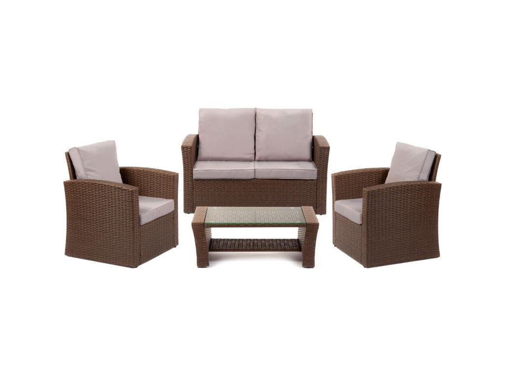 Doprajte si nádych luxusu so záhradným nábytkom od českej spoločnosti FIELDMANN. Súprava je vyrobená z umelého ratanu a poskytne pohodlné a štýlové posedenie v záhrade alebo na väčšej terase. Vďaka svojmu elegantnému dizajnu nábytok FIELDMANN neurobí hanbu žiadnemu vonkajšiemu ani vnútornému priestoru. Súprava sa skladá z konferenčného stolíka so sklenenou deskou, dvojsedáku a dvoch kresiel. Jej súčasťou sú aj vankúše s kvalitnými nepremokavými poťahmi, takže si nemusíte robiť starosti so zháňaním podsedákov. Okrem toho je tento nábytok ľahký a ľahko prenosný. Rozloženie priestoru môžete bez námahy meniť podľa nálady alebo súpravu upratať v prípade nepříznivého počasia. Umelý ratan sa ľahko udržiava, v podstate si vystačíte s vlhkým hadríkom a bežným čistiacim prostriedkom. Táto odolná záhradná súprava sa postará o pohodlí vášho vonkajšieho priestoru na dlhé roky a poskytne vám komfort a oddych bez nadmernej údržby. Kľúčové vlastnosti: - dvojmiestne sedadlo - 2 kreslá - konferenčný stolík - vhodný na použitie v interiéri aj exteriéri - polštáre a nepremokavé poťahy sú súčasťou balenia - umelý ratan Špecifikácie: - Pohovka je dvojmiestna, 2 kreslá a konferenčný stolík. - rozmery stolíka 73 × 45 × 36 cm - číra sklenená deska - rozmery kresiel 64 × 73 × 82 cm - rozmery sedadla 116 × 73 × 82 cm - vankúše a nepremokavé poťahy sú súčasťou balenia - použitie v exteriéri aj interiéri - umelý ratanDodatočné parametre