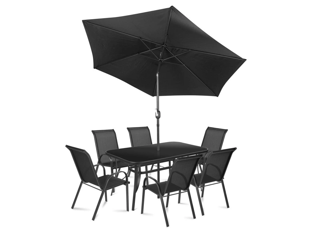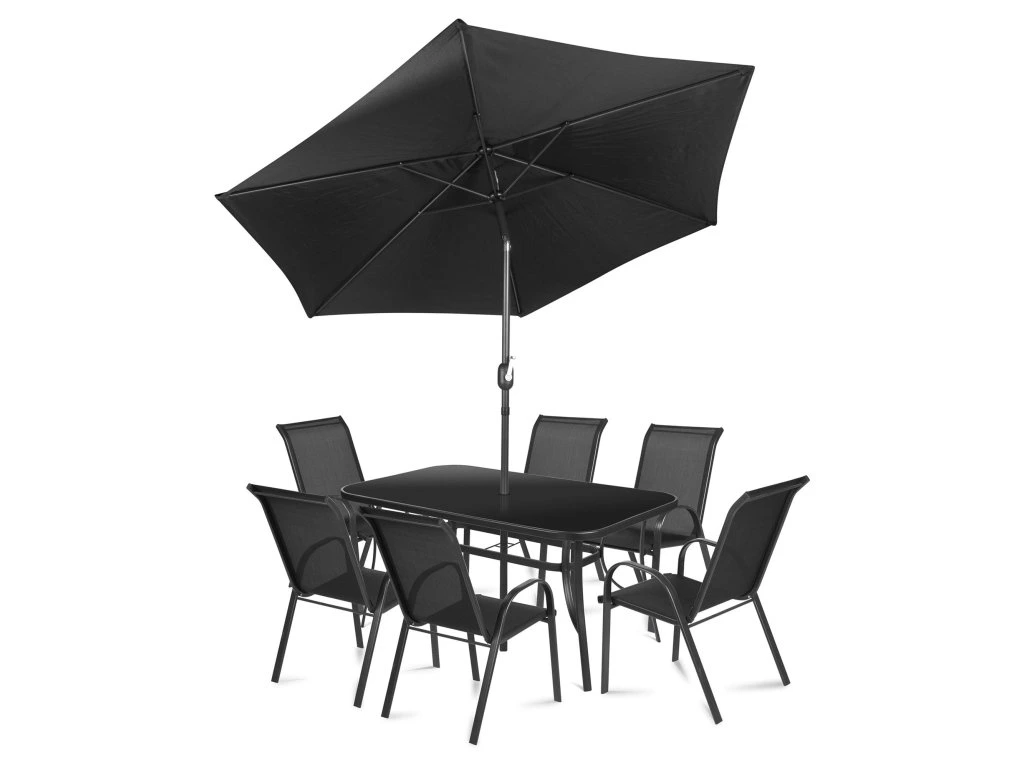 Súprava záhradného nábytku RUBY DARK ponúka nielen moderný a elegantný vzhľad, ale aj maximálne pohodlie pri používaní vrátane jednoduchej údržby. Priestranný záhradný stôl (150 x 96 x 71 cm) má dosku z čierneho tvrdeného skla. Dostatočnú pevnosť a stabilitu zabezpečuje konštrukcia s oceľovo-hliníkovými profilmi. Vďaka nízkej hmotnosti sa so stolom ľahko manipuluje. Bez problémov odolá akýmkoľvek poveternostným podmienkam a nevyžaduje si špeciálnu údržbu.Pohodlné, ergonomicky tvarované záhradné stoličky majú rozmery 55 x 77 x 92 cm a nosnosť až 120 kg. Výplň stoličiek je vyrobená z odolnej a pružnej syntetickej tkaniny, ktorá sa nespáli ani na priamom slnku. Súčasťou súpravy je aj slnečník s priemerom 3 m a nastaviteľným sklonom. Slnečník s čiernym poťahom zo 100 % polyesteru 160 g/m2 sa ľahko otvára a zatvára pomocou rukoväte. Vo variante RUBY LIGHT má slnečník krémový poťah.