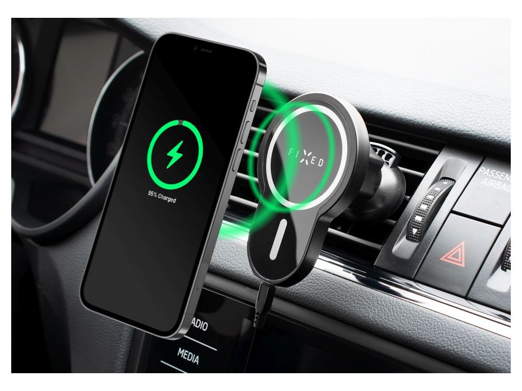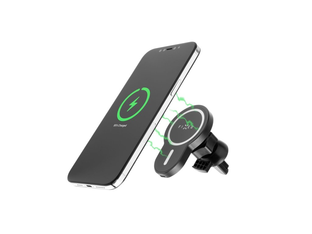 Držiak FIXED MagClick vyvinutý priamo pre najnovšie Apple iPhone séria 12 s funkciou MagSafe vám umožní mať telefón v aute pekne na očiach a zároveň ho pohodlne dobíjať počas jazdy. Vďaka integrovaným magnetom stačí len priložiť telefón k držiaku a pomocou MagSafe sa okamžite sám zaistí. Drží bezpečne a bez problémov vydrží všetky otrasy spôsobené jazdou. Pre rýchle nabíjanie vášho iPhonu je držiak MagClick vybavený vysoko výkonnou cievkou s výkonom 7,5 W a až 15 W pre ostatné chytré telefóny, dokáže tak doplniť energiu v čo najkratšom čase. Držiak je určený na uchytenie pomocou pevných klieští do ventilačnej mriežky. Pomocou otočného kĺbu si nastavíte telefón do ideálneho uhla tak, aby bol v prípade potreby pekne na očiach. Minimalistický a moderný dizajn držiaka neprekáža na palubnej doske a skvele zapadne do interiéru vášho vozidla. S držiakom FIXED MagClick bude vaša jazda s telefónom v aute pohodlnejšia a hlavne bezpečnejšia ako kedykoľvek predtým. Vlastnosti: - držiak s bezdrôtovým nabíjaním - integrované magnety pre MagSafe - ideálny doplnok pre všetky Apple iPhone série 12 - určený na pripevnenie do mriežky ventilácie automobilu - rýchle nabíjanie s výkonom 7,5 W pre iOS a až 15W pre ostatné chytré telefóny - minimalistické rozmery - otočný kĺb pre nastavenie telefón aj pri najväčších otrasoch - ponecháva prístup k ovládacím tlačidlám a konektorom - kompatibilný s puzdrami a krytmi podporujúcou technológiu MagSafe - ochrana proti prehriatiu, skratu aj prepätiu Technické detaily: - vstup: USB-C, DC 5V/2.4A, 9V/2A - výstup iOS: 5: 5:5. 7.5W/ 10W/ 15W - materiál: Aluminium + Acrylic (PMMA) - USB-C konektor - hmotnosť: 115g - Rozmery držiaka: 111,5 x 107 x 41.5mm - Poznámka: pre využitie maximálnej rýchlosti nabíjania zariadenia s iOS je nutné použiť pre držiak FIXED MagCDodatočné parametre