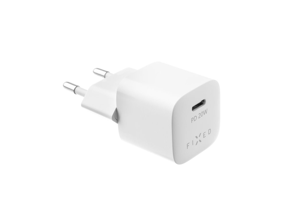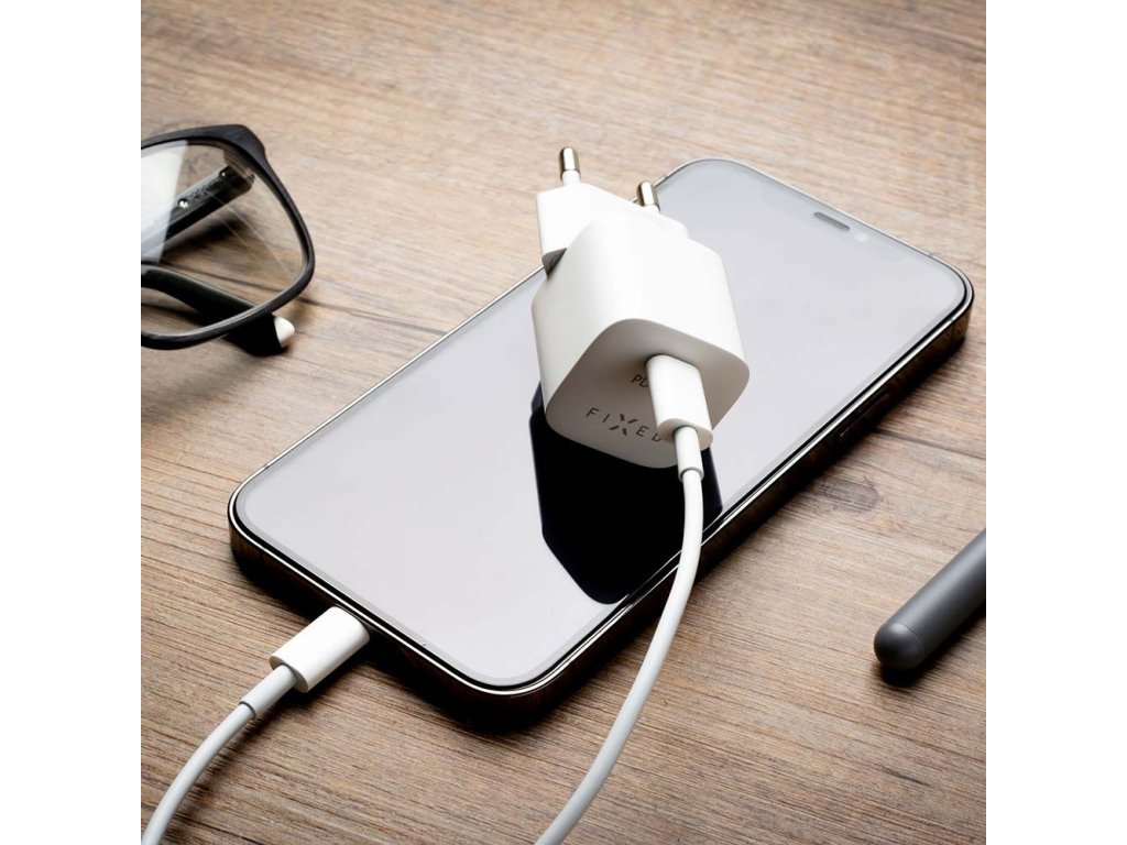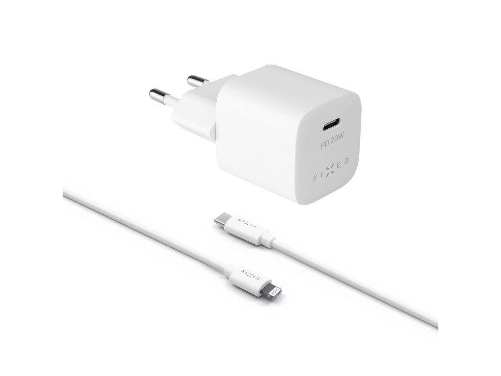FIXED Mini sieťová nabíjačka s výstupom USB-C a káblom USB-C/Lightning, podpora PD, 1 meter, MFI, 20 W, biela