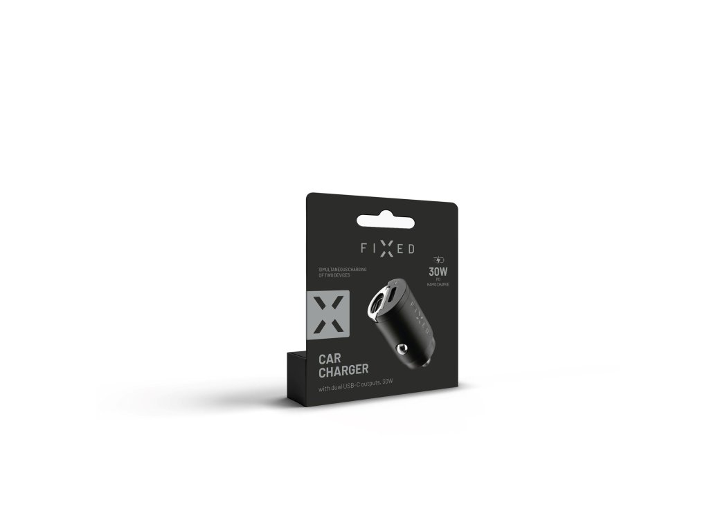 FIXED nabíjačka do auta s výstupom 2xUSB-C v miniatúrnom vyhotovení, podpora PD, 30 W, čierna