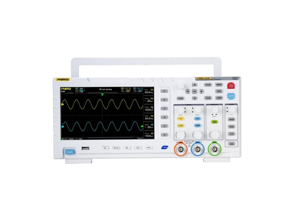 Generátor signálu osciloskopu 2 v 1 FNIRSI 1014DFNIRSI 1014D je kompaktní digitální osciloskop určený pro elektronické servisy, výzkumná a vývojová oddělení, technické vzdělávání a hobby. Umožňuje současnou analýzu a generování signálu, což výrazně rozšiřuje možnosti použití při diagnostice obvodů, testování prototypů nebo výuce práce s průběhy. Zařízení má dva vstupní kanály s impedancí 1 M? a podporuje šířku pásma 100 MHz při vzorkování 1GSa/s. Obsluhu usnadňuje 7palcový displej LCD s rozlišením 800 × 480 px. Je možná automatická analýza, FFT, režim X-Y a záznam kurzoru. K dispozici je také 1GB interní paměť s možností uložení až 1 000 průběhů a 1 000 snímků obrazovky a data lze snadno exportovat do počítače prostřednictvím USB.